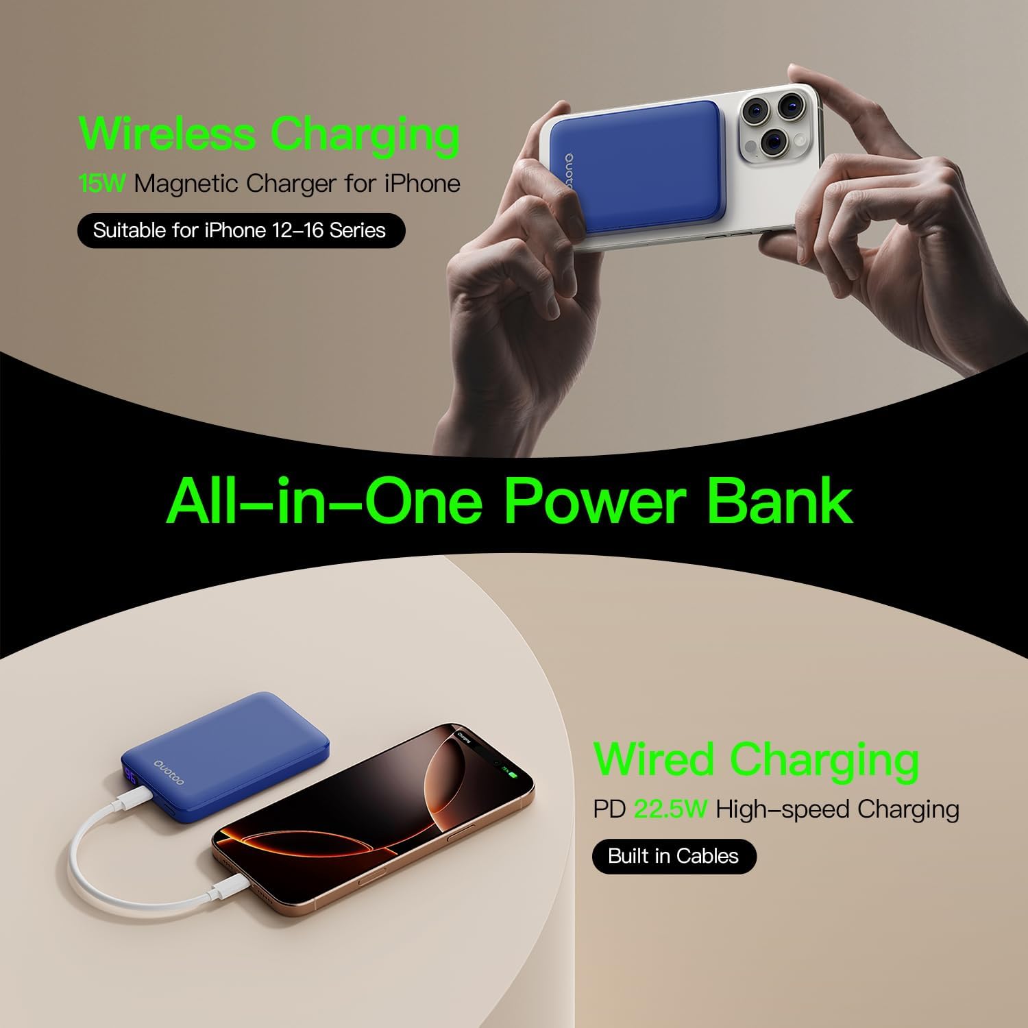 - 【What You Ge】5000mAh magnetic power bank for iPhone (2025 version) x 1, C-C cable x 1, user manual x 1.Ouotoo's professional technical support and team service,OUOTOO pays attention to quality issues and ensures that the magnetic suction wireless charger you receive has undergone a series of quality testing processes, Enjoy peace of mind with our 733-day limited warranty, ensuring you won't worry about returns. If needed, we will provide solutions