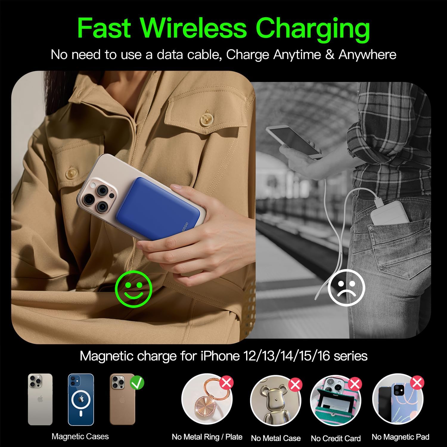 - 【Magnetic Wireless Power Bank】Specially designed for seamless compatibility, this portable charger perfectly supports iPhone 16, 15, 14, 13, and 12 series, including iPhone 16 Plus, 15 Plus, 14 Plus; iPhone 16 Pro, 15 Pro, 14 Pro, 13 Pro, 12 Pro; iPhone 16 Pro Max, 15 Pro Max, 14 Pro Max, 13 Pro Max, 12 Pro Max; and iPhone 13 mini, 12 mini. Attention: We recommend using MagSafe phone cases or not charging with phone cases to obtain sufficient suction for better grip