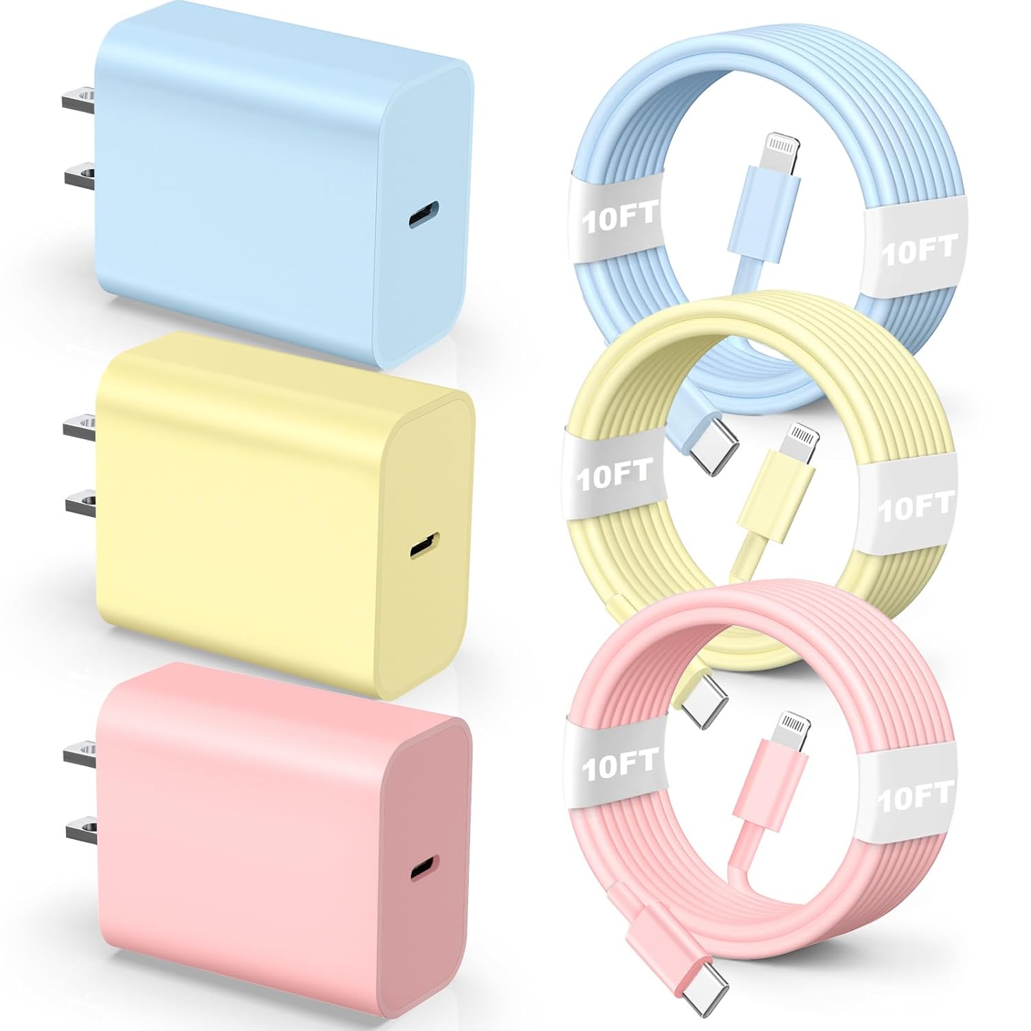 Compatible with iPhone 14 13 12 Charger, 20W Fast Charging Wall Charger,10 FT USB ightning Cable,Phone Charger Cord for Phone 14/13/12/12 Pro Max/11/Xs Max/XR/X,AirPods Pro and More(Pink/Yellow/Blue)