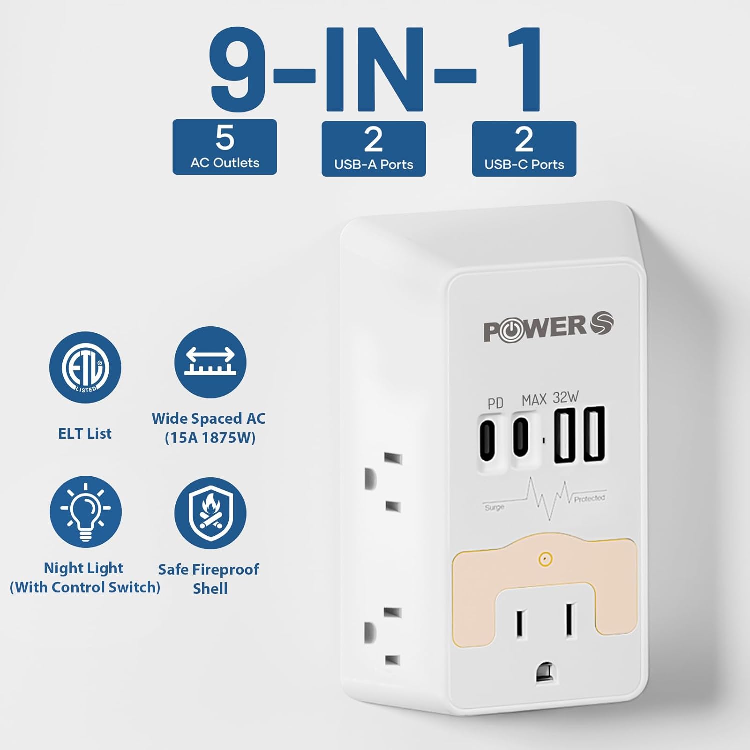 - Maximize Your Wall Socket : Expand a single outlet into 5 AC plugs and 4 USB ports (2 USB-C + 2 USB-A) for all your devices. This wall outlet features a 20W USB-C PD port to fast-charge compatible devices, plus traditional sockets for all your needs