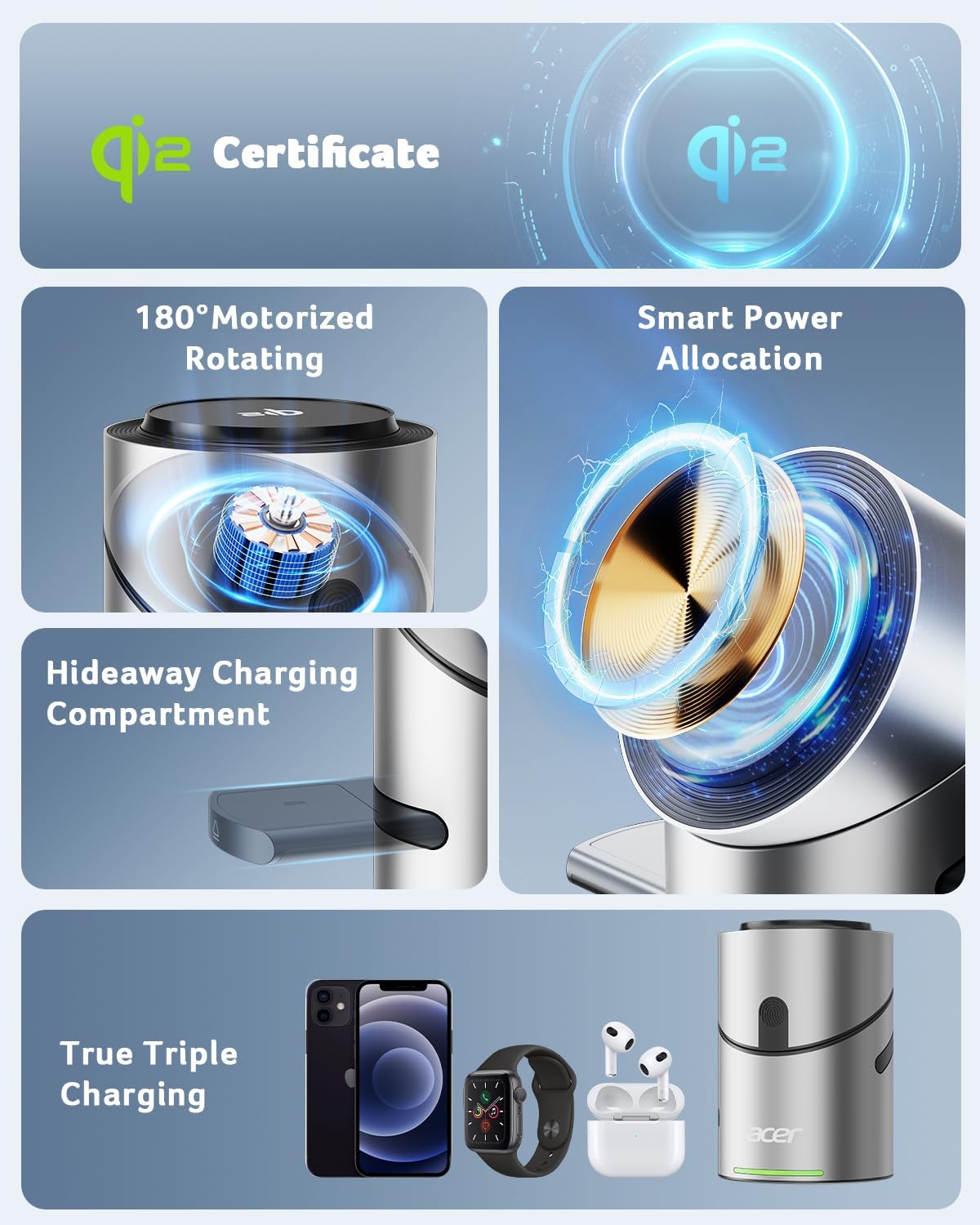 - [Qi2 Certified 15W Triple Fast Charging] Acer qi2-certified 3-in-1 wireless charging station delivers 15w max power. Its magnetic 360° rotating phone charger positions devices perfectly while charging apple watch & airpods simultaneously. Optimized as a 3-in-1 charging station for apple ecosystems, it provides full-speed charging (15w/5w/3w) with smart power distribution, outperforming standard wireless chargers.