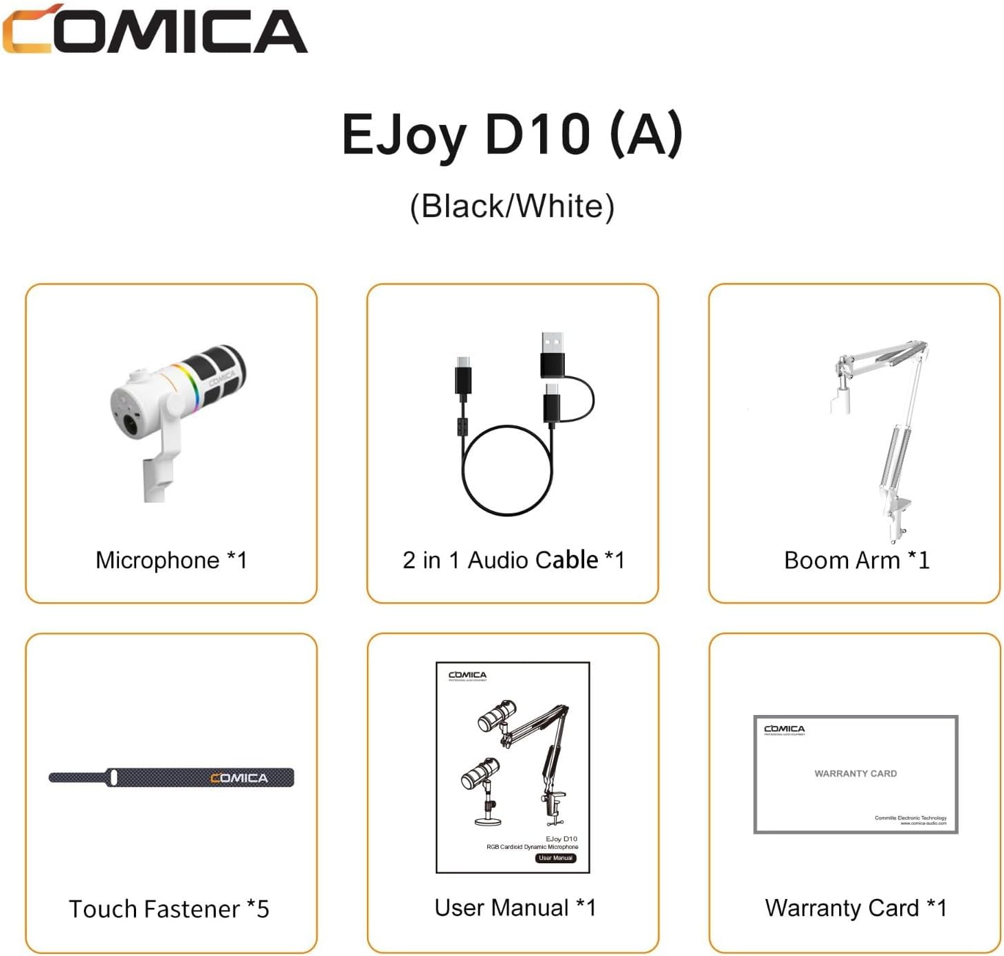 COMICA EJoy D10 A USB/XLR Dynamic Microphone with RGB Light &CalMix Denoise &Mute Button- Studio-Quality Cardioid Mic with Boom Arm Stand for Gaming, Streaming, Podcast,YouTube(PC/PS5/Xbox/Mac-White