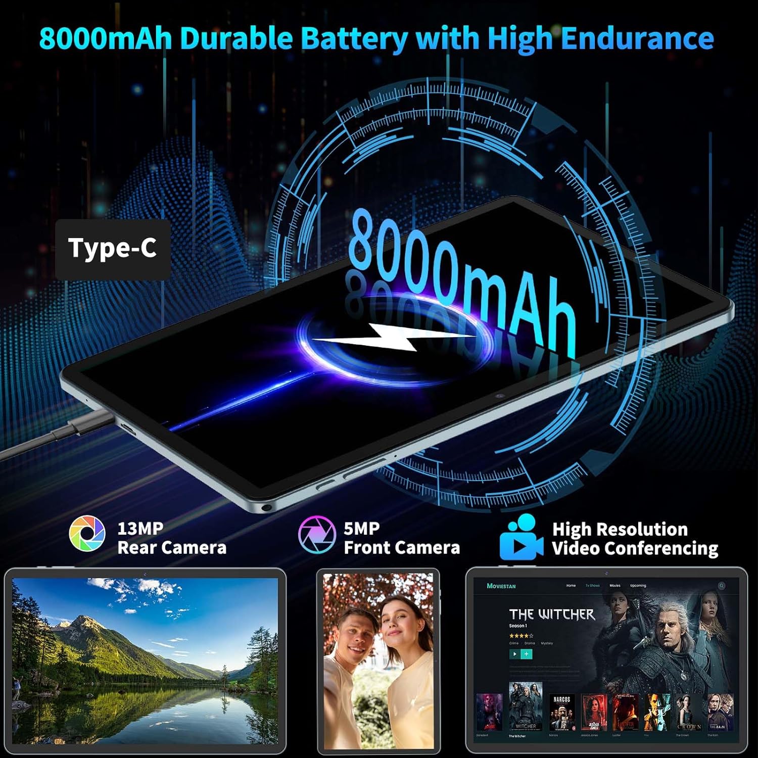 - 【8000 mAh Battery & Dual Cameras】The 8000mAh battery with USB Type-C ensures long-lasting use of the tablet, making it suitable for traveling, commuting and outdoor activities.The 5MP front camera and 13MP rear camera can meet your daily photography and video call needs. You can also use it to take videos and record your daily life