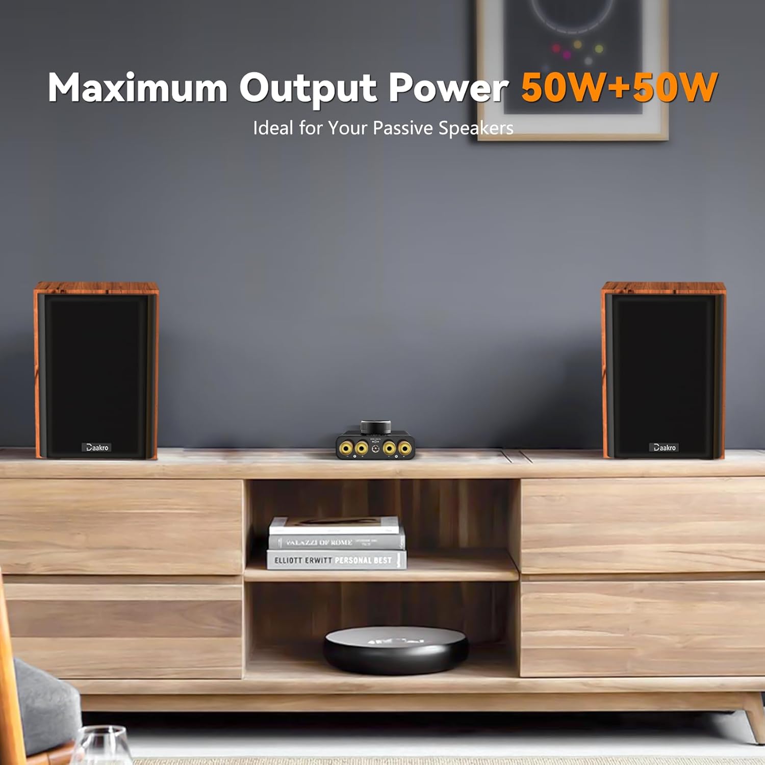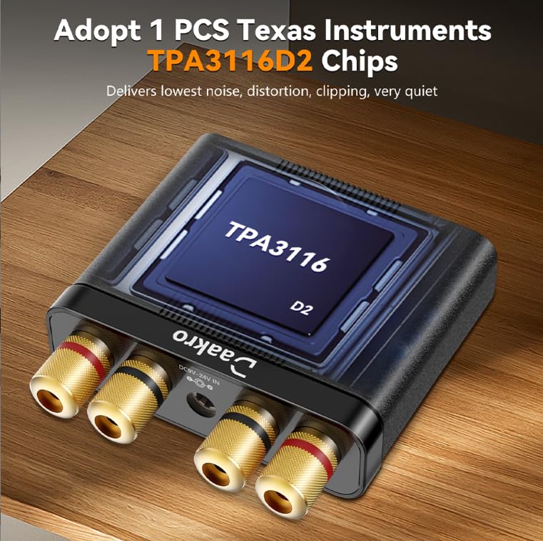 - [Upgraded Chip for Higher Output Power]This AK30 mini stereo amplifier uses Texas high performance TPA3116 chips, and comes with a 12V5A DC power supply, ensuring reliable performance. When paired with a 4-ohm passive speaker, the amplifier delivers a maximum output power of 50W+50W.This stereo amplifier achieves SNR that exceeds 92dB, THD below 0.04%, and covers a wide frequency range from 20Hz to 20kHz, ensuring an optimal balance between volume and detail.