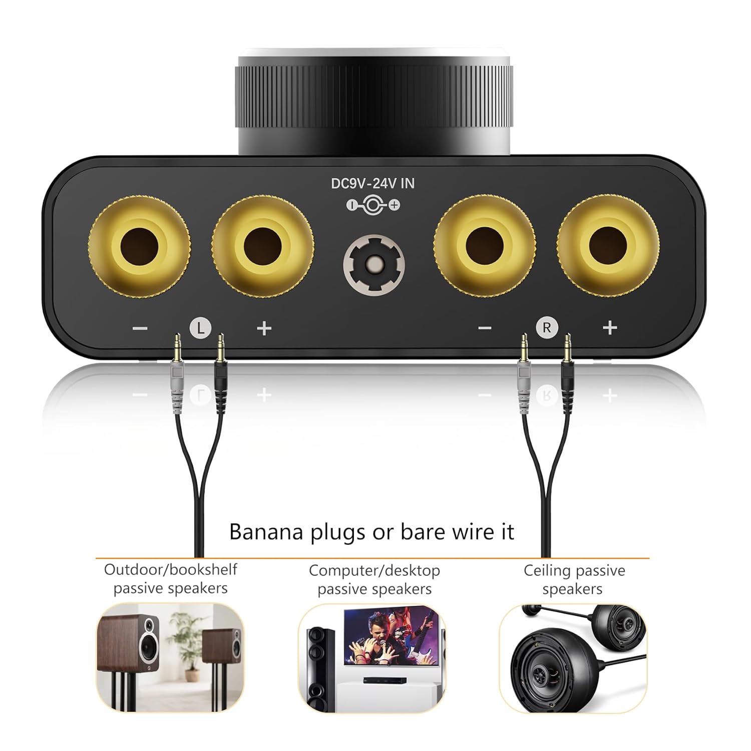 - [Super Compatibility]With a DC 9V-24V wide operating voltage design, you can easily take it to a friend's house to connect the setup with carrying a power adapter. Our Bluetooth Audio Amplifier can be widely applied to various Tablet PC, TV, Smartphone, Laptop with Bluetooth and etc, versatile and easy to use. (NOTE: it does not apply to a number of products launched by Amazon such as Echo, Alexa ect. and Bose speakers).