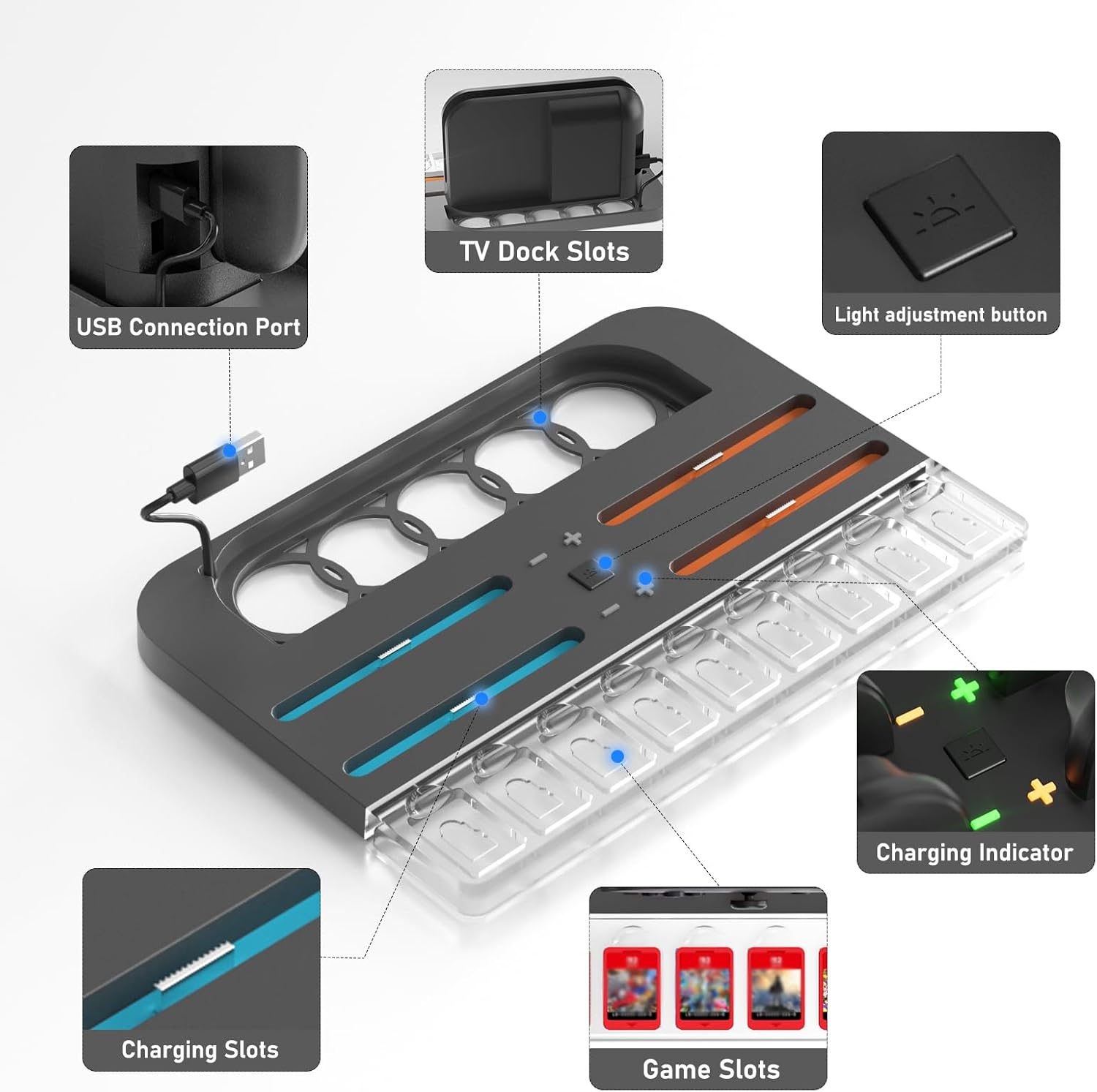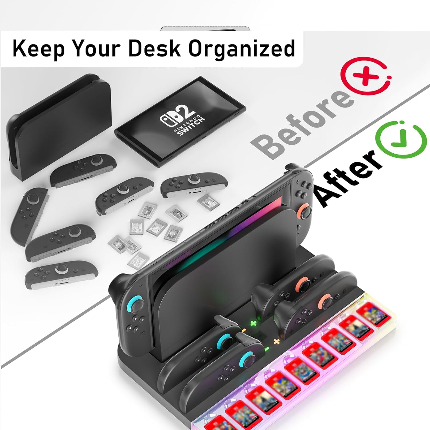 - [All-in-One Switch 2 Charging and Storage Dock] This charging and storage stand can be used to charge 4 Switch 2 joycon. Provide sufficient storage space:it can store 9 game cards, 4 joycons and 1 Nintendo Switch 2 original TV dock. Keep your game space clean and orderly, and keep your game equipment in order.