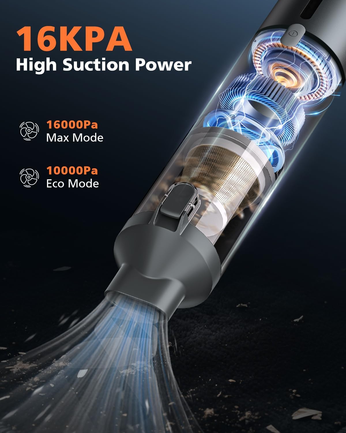 - Powerful Suction: Equipped with a high-speed brushless motor, this portable car vacuum delivers up to 16,000 Pa of suction in its maximum mode. Whether you’re at home, in the office, or in your car, it quickly removes dust, debris, pet hair, and other larger particles. Two suction modes are available to meet your everyday cleaning needs—standard and strong.