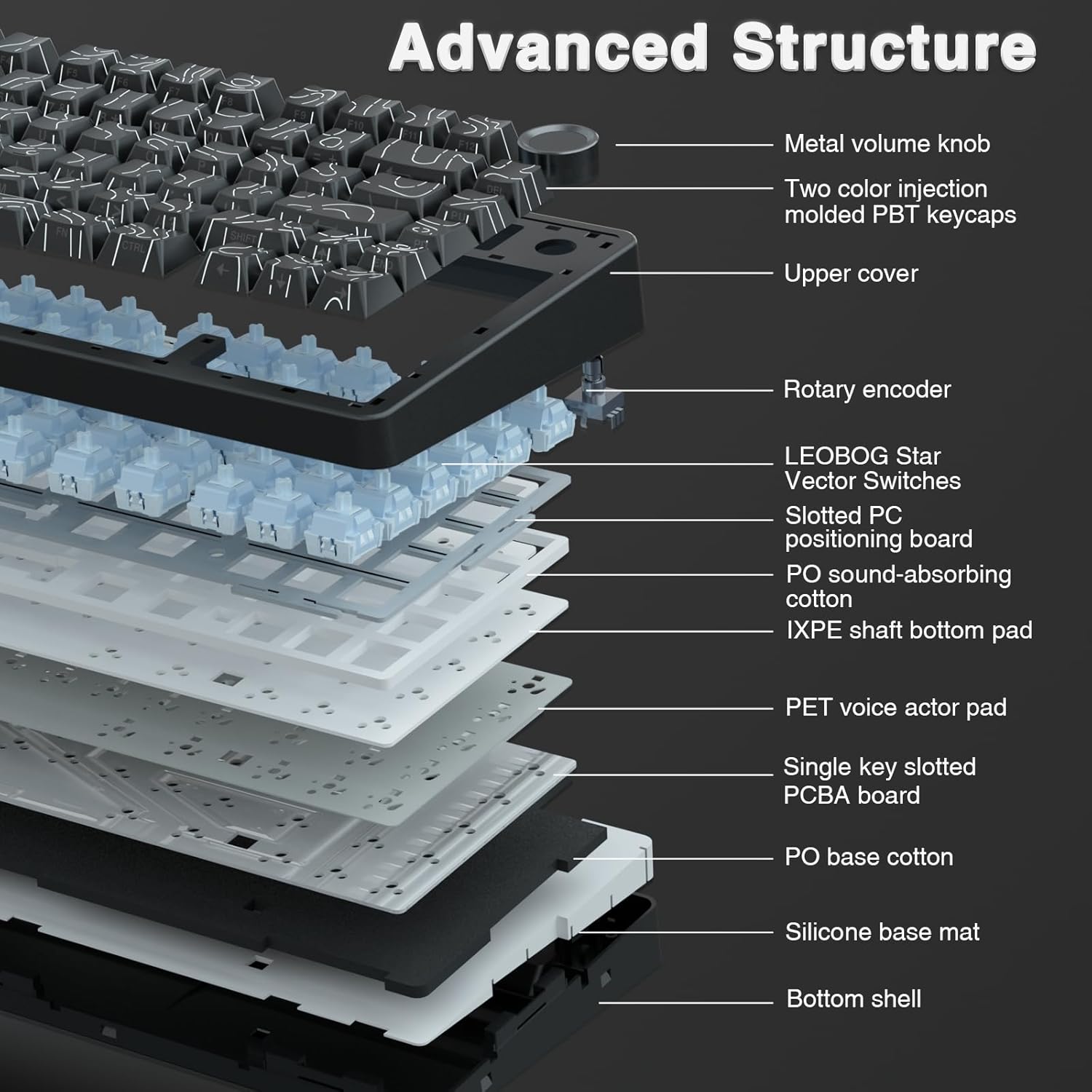 - Hot-swap Custom Keyboard: This custom mechanical keyboard with hot-swappable base supports 3-pin or 5-pin switches replacement. Even keyboard beginners can easily DIY there own keyboards without soldering issue. F75 Pro gaming keyboards equipped with pre-lubricated stabilizers and LEOBOG star vector switches, bring smooth typing feeling and pleasant creamy mechanical sound, provide fast response for exciting game