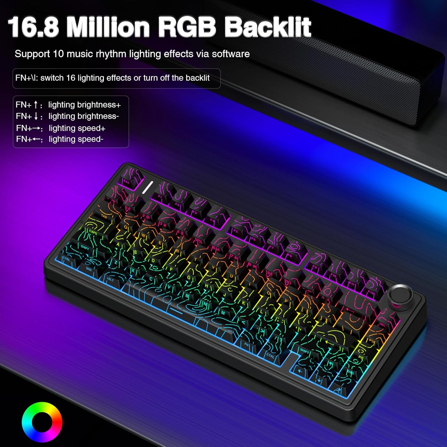 - 16.8 Million RGB Backlit: F75 Pro light up led keyboard features 16.8 million RGB lighting color. With 16 pre-set lighting effects to add a great atmosphere to the game. And supports 10 cool music rhythm lighting effects with driver. Lighting brightness and speed can be adjusted by the knob or the FN + key combination. You can select the single color effect as wish. And you can turn off the backlight if you do not need it