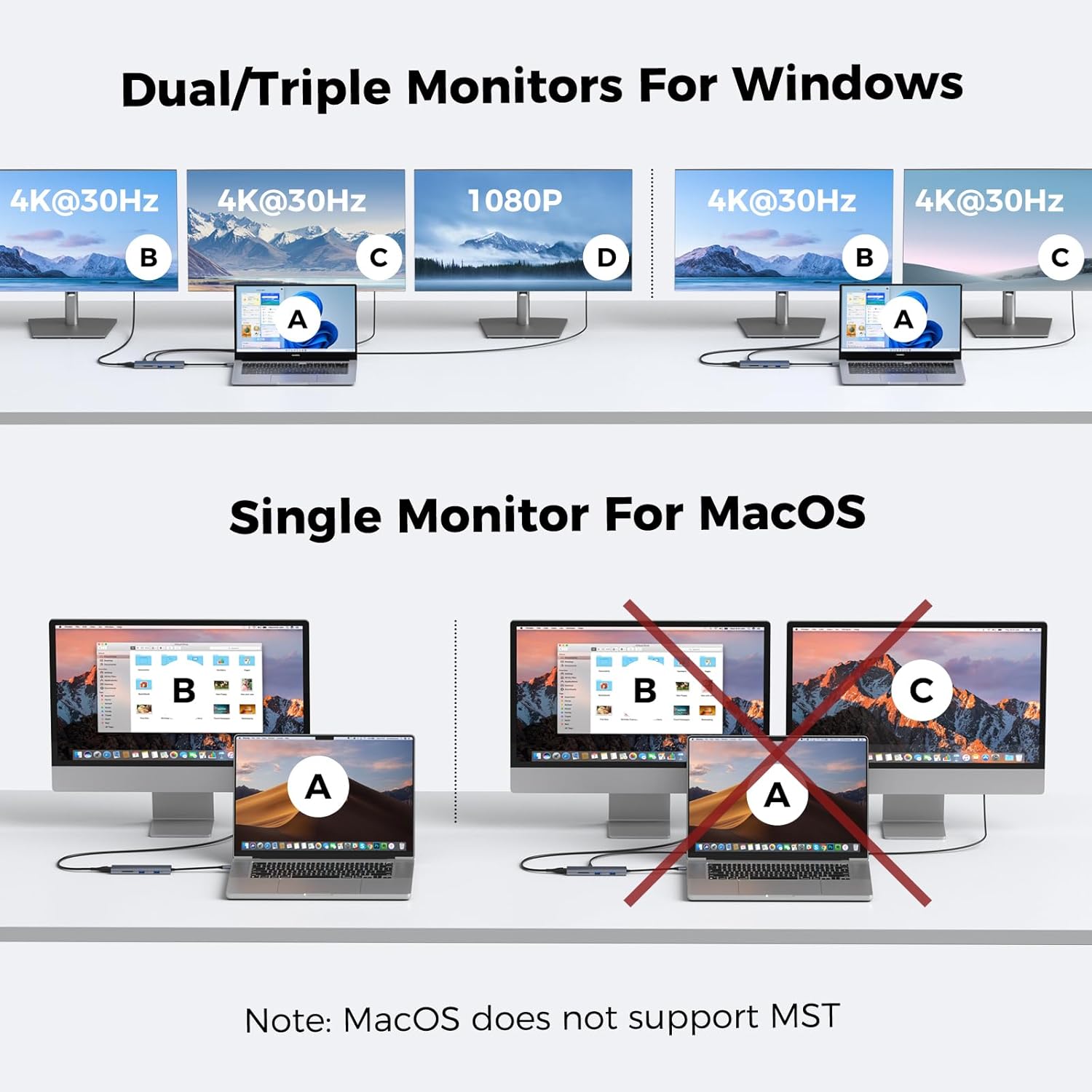 - 【Triple / Dual Display Support】 The usb c hub with usb c video out supports dual 4K@30Hz and triple display(2* 4K@30Hz + 1*1080P), Ideal for DP1.4 laptops to extend to dual 4K@30-60Hz displays (Note: MacBook supports only one extended monitor).