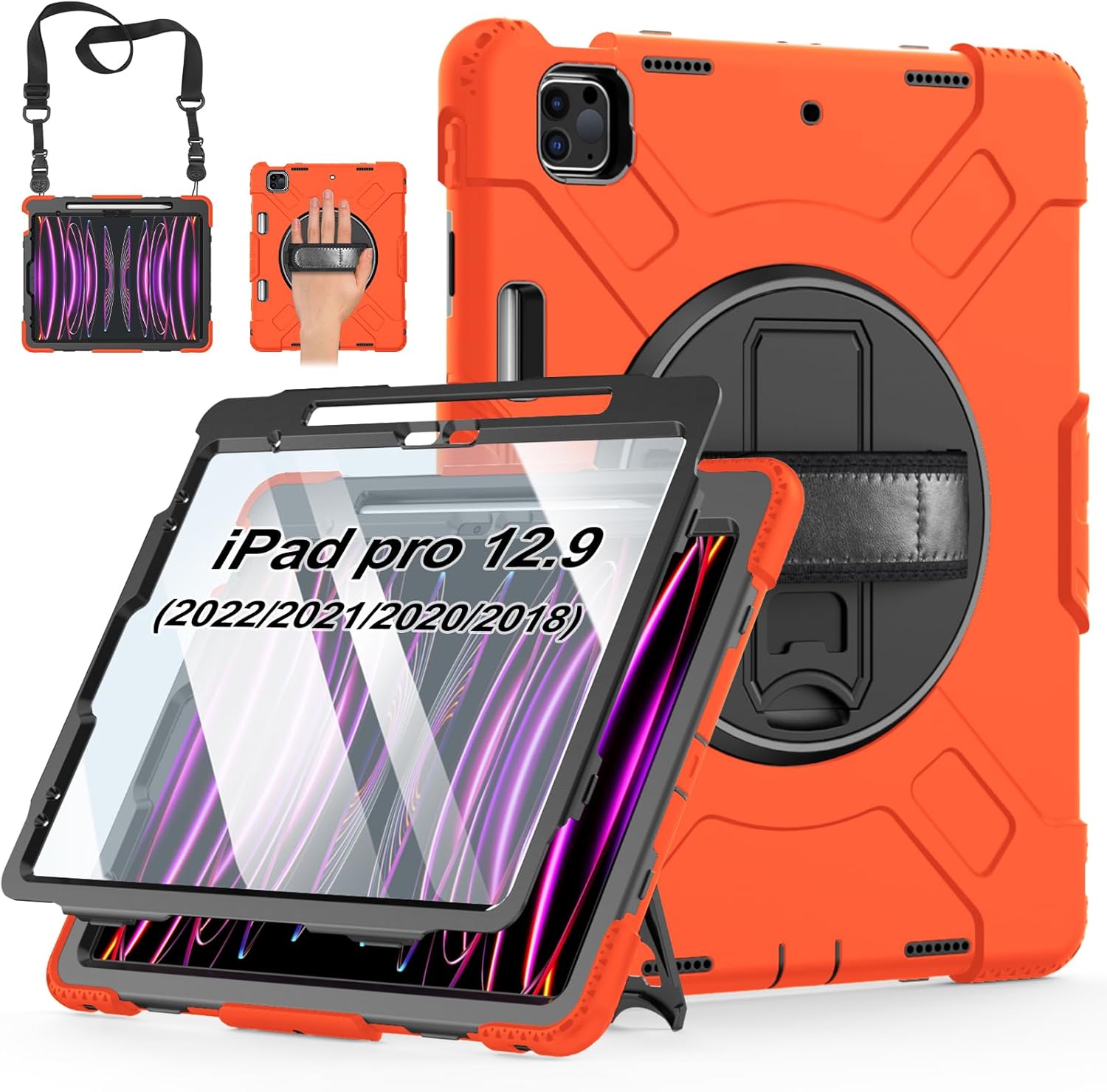 Case for iPad Pro 12.9 2022/2021/ 2020/2018: Cover for iPad Pro 12.9 6th/ 5th/ 4th/ 3rd Generation with Screen Protector- Stand- Pencil Holder- Handle- Shoulder Strap-Orange