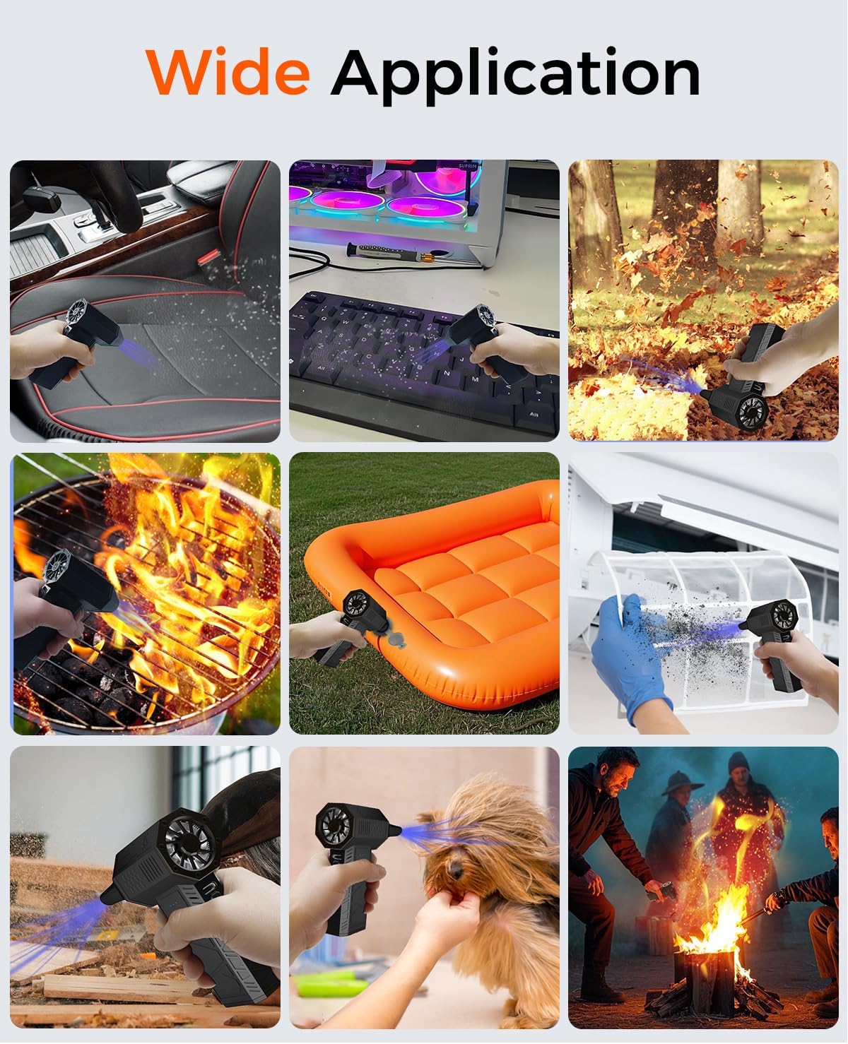 - Wide Applications for Home and Outdoor Use - The KONPAYDE Turbo Dryer Blower is a versatile tool for everyday use. Clean computers, keyboards, cameras, and home appliances with ease. Use it as a jet blower for picnic fires, or to inflate lifeboats and outdoor equipment. It’s also a mini air duster for camera lenses and gadgets, making it your go-to companion for a cleaner and more efficient lifestyle.