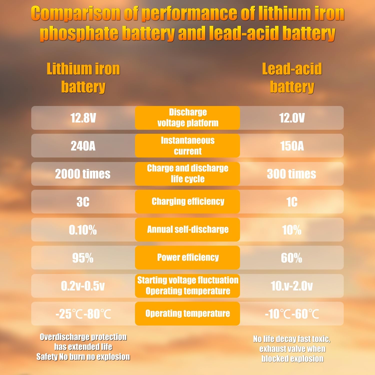 - Enhanced Safety Features: Equipped with advanced BMS (Battery Management System), this LiFePO4 battery provides enhanced safety with overcharge, over-discharge, and overcurrent protection. It safely powers high-demand electronic systems, including start/stop functions, and outperforms conventional lead-acid batteries