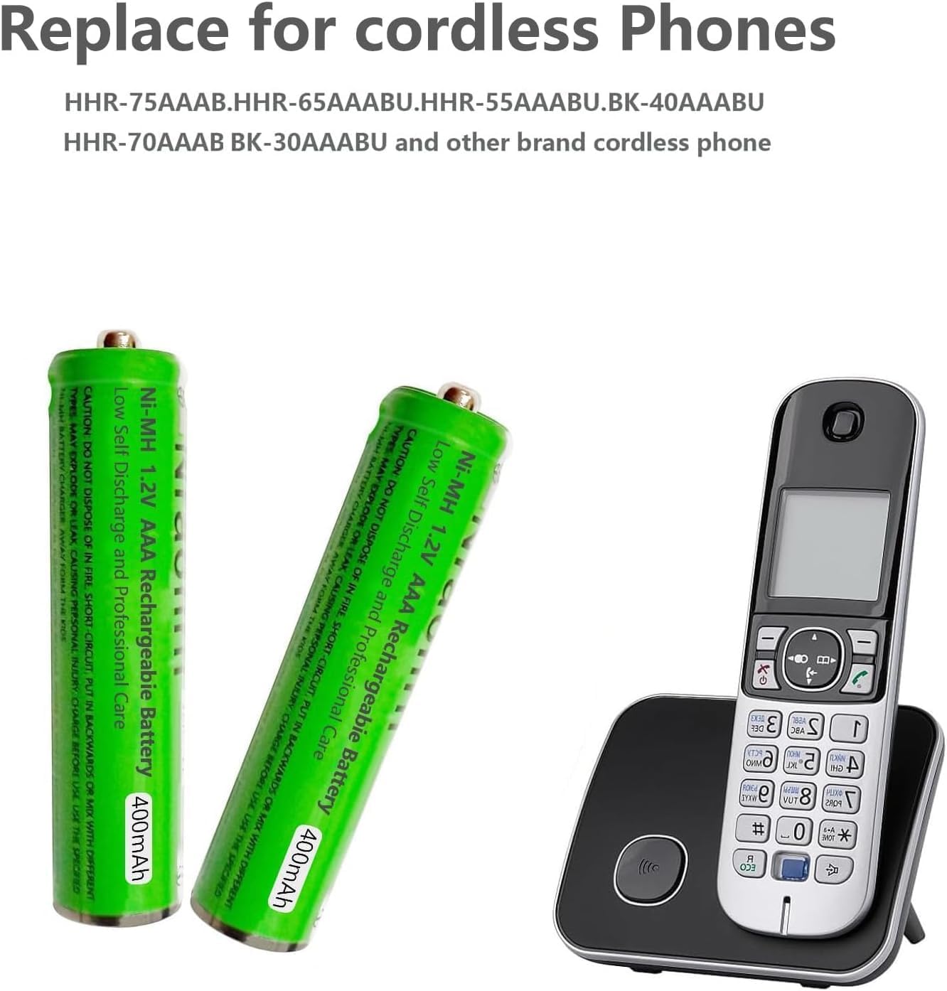 - Replacement batteries for cordless phones: capacity: 400 mAh, voltage: 1.2 V, size: AAA; a box of NiMH AAA batteries 1.2 V, widely used, suitable for most Panasonic/Motorola cordless phones. compatible replacement for Panasonic battery models: HHR-55AAABU /HHR-65AAABU/HHR-70AAAB/HHR-4DPA/HHR-75AAAB/BK-40AAABU/BK-30AAABU.