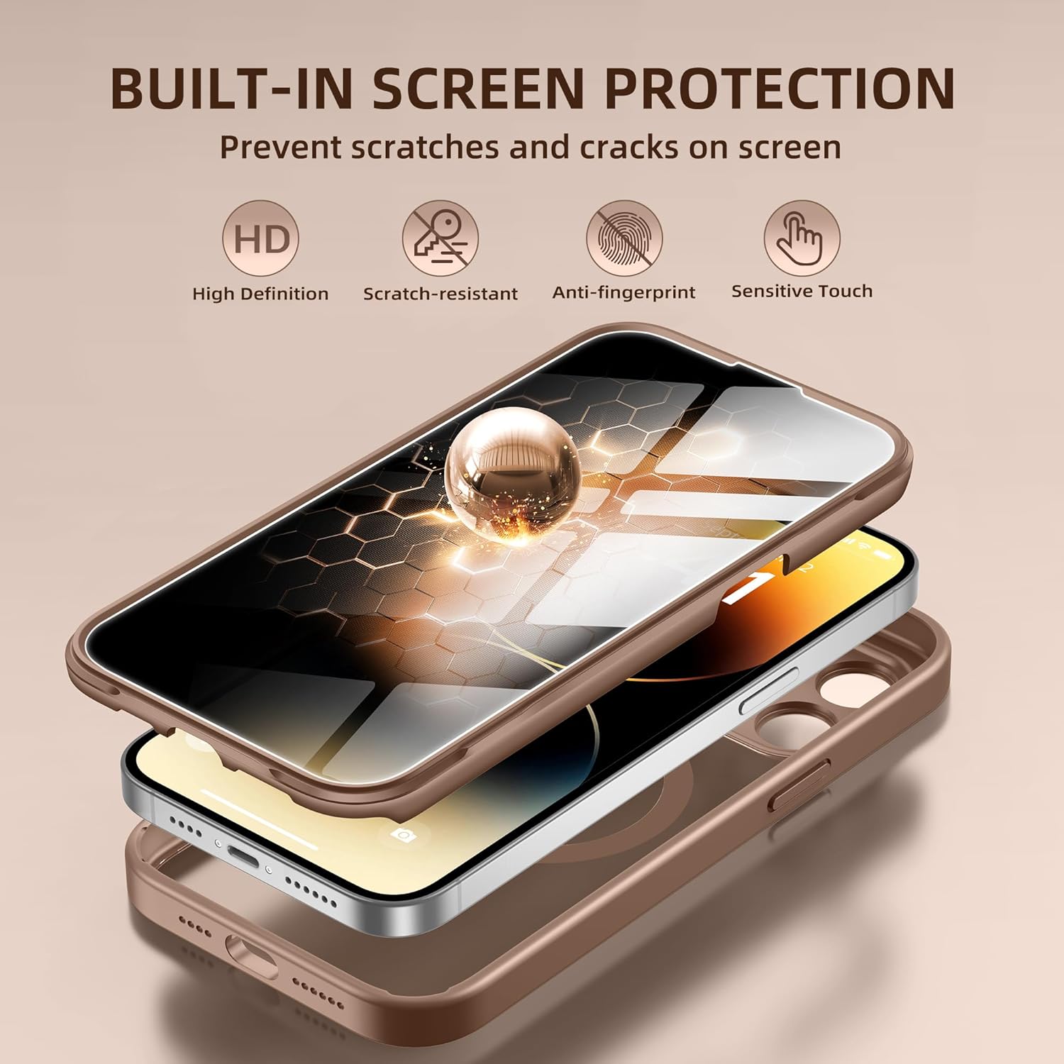 BERFY Magnetic for iPhone 14 Pro Max Case, Compatible with MagSafe, Built-in Privacy Screen Protector and Upgraded Camera Protection,Anti-Spy Full Body Shockproof Phone Case for 14 Pro Max,Desert Gold