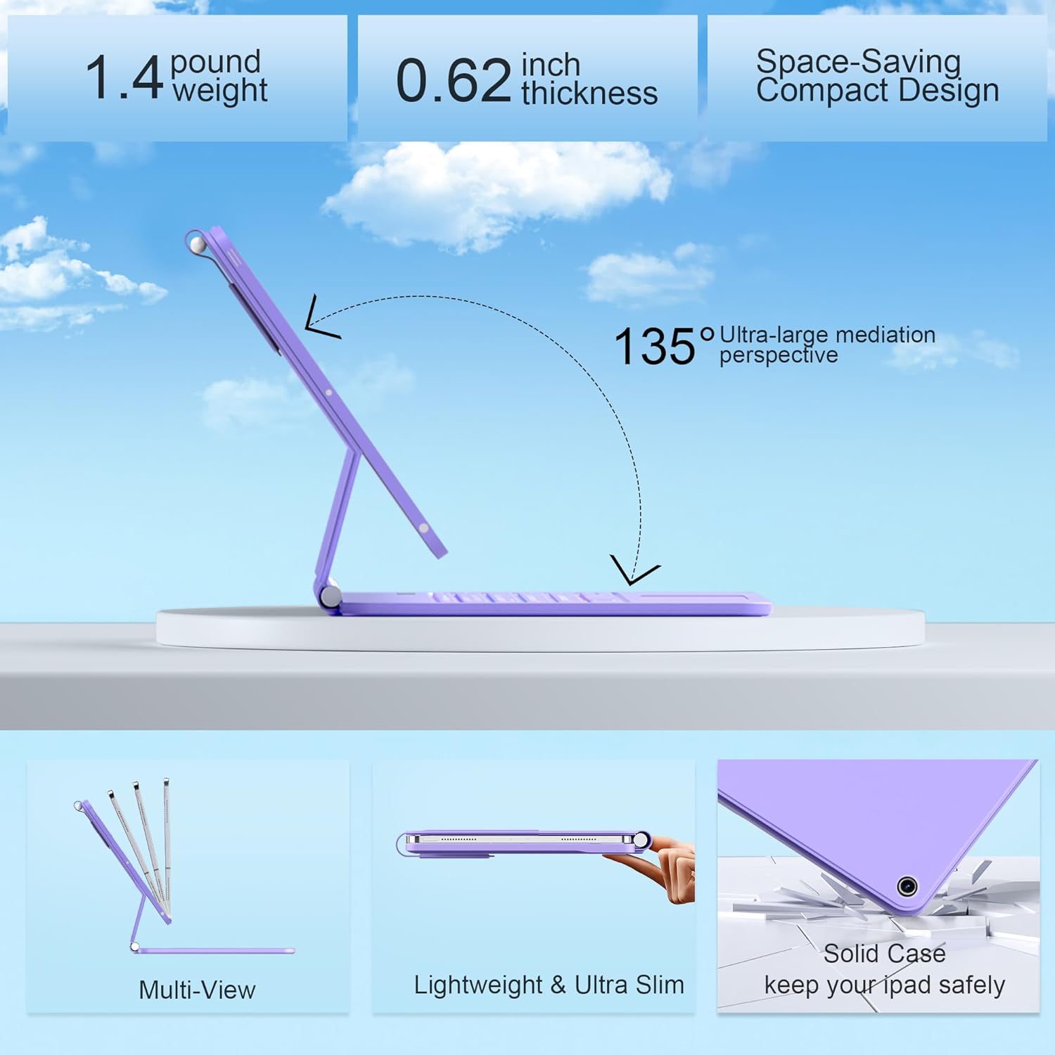 - Floating Cantilever Stand & Multi-View Flexibility: The magic-style floating cantilever stand and strong magnetic attraction hold iPad firmly and stably in place like a laptop, the floating cantilever design allows you to easily adjust to your favorite viewing angle for typing or browsing.