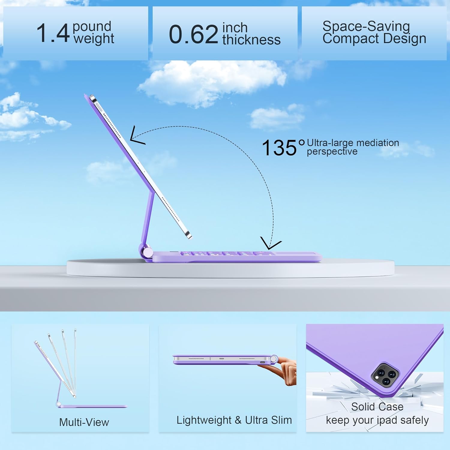 - Backlit Keyboard for iPad Air 13 inch and iPad Pro 12.9: From dawn to dusk, adapt effortlessly! Adjusting 7 backlight and 3 levels of brightness ensures clear visuals in every setting, enhancing your immersive experience. This feature not only adds a touch of style but also makes typing in low-light conditions more comfortable.