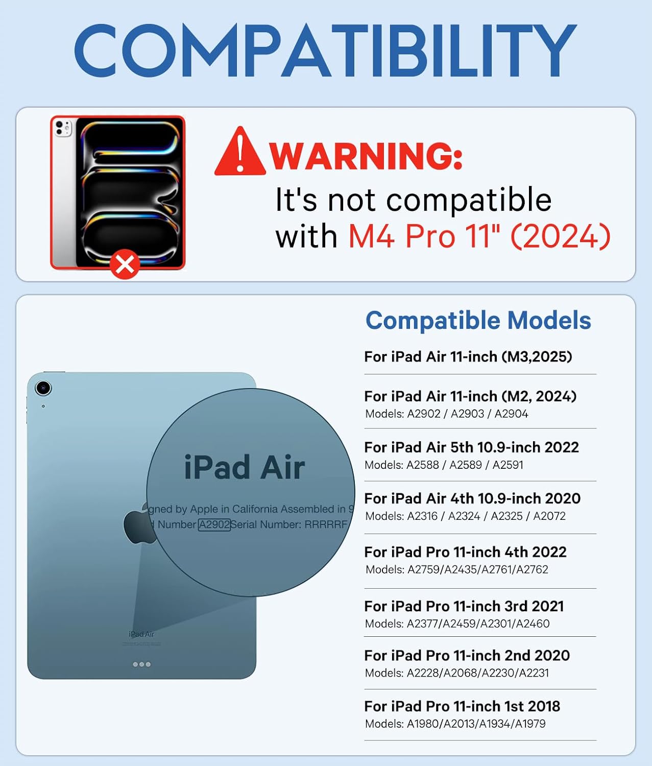 - Compatible Devices : iPad Air 11 inch (M3/M2) 2025/2024, iPad Air 5th/4th Gen., iPad Pro 11" 4th/3rd/2nd/1st Gen.(Not for Pro 11" M4 2024) iPad Air 11 inch (M3/M2) 2025/2024, iPad Air 5th/4th Gen., iPad Pro 11" 4th/3rd/2nd/1st Gen.(Not for Pro 11" M4 2024)