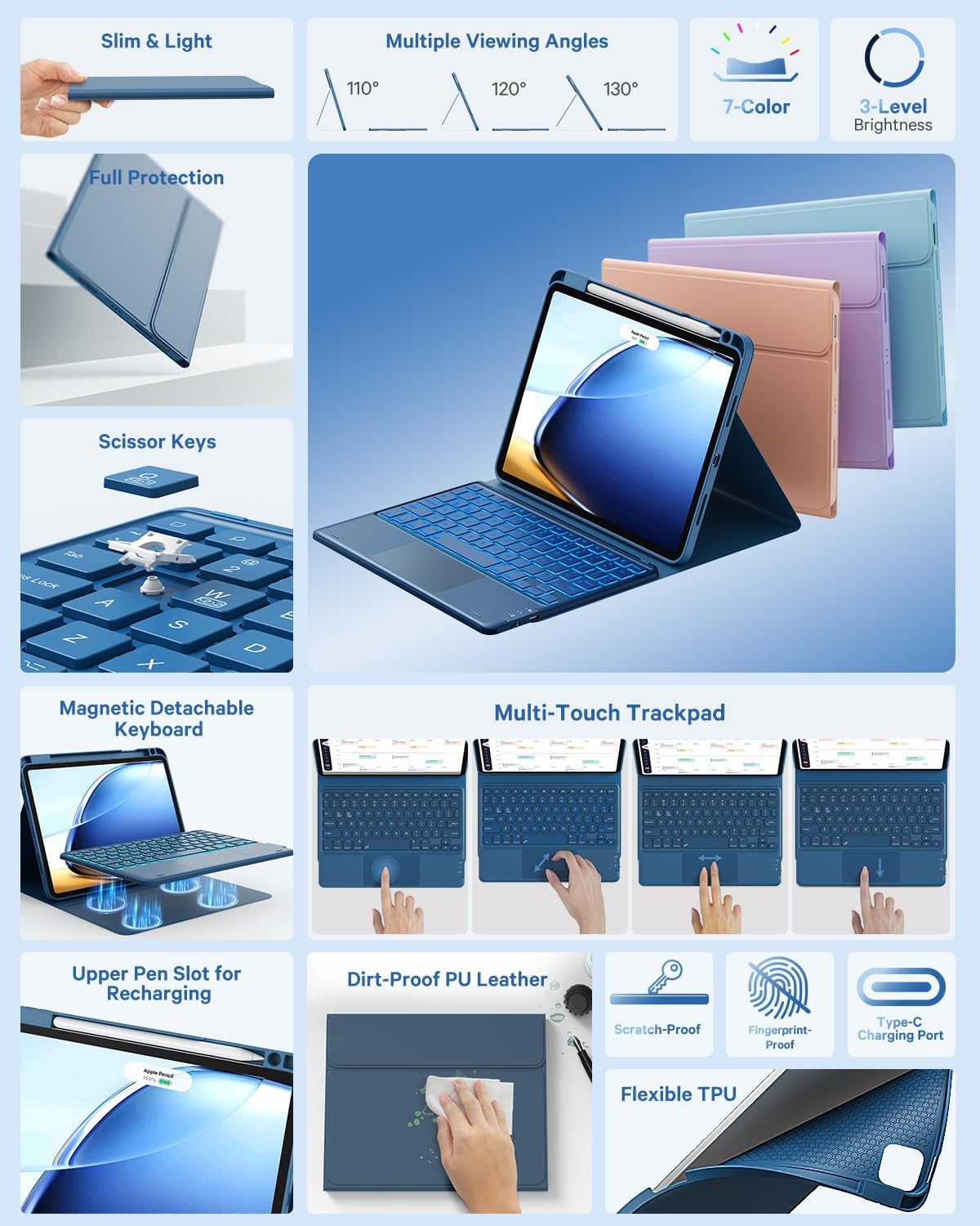 GreenLaw Keyboard Case for iPad Air 11-inch (M3/M2) 2025/2024 & Air 4th/5th Gen & iPad Pro 11 inch (1st/2nd/3rd/4th Gen), Smart Touchpad, 7-Color Backlit, Stain Resistant Cover, Navy Blue