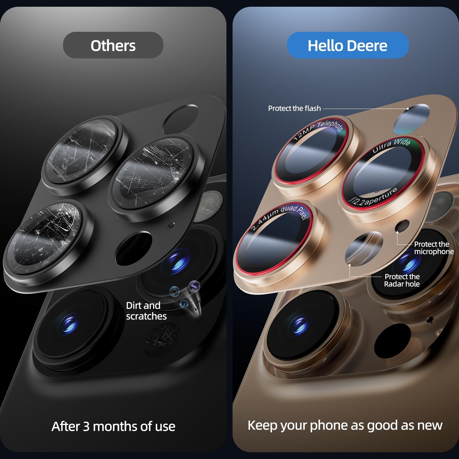 - 【For iPhone 16 Pro Max/iPhone 16 Pro/iPhone 15 Pro Max/iPhone 15 Pro /iPhone 14 Pro Max/iPhone 14 Pro】: HelloDeere tailored this high-end camera lens protective film according to the structure and function of the iPhone 16 Pro Max camera. The upgraded version of 2025 aviation metal has improved drop resistance, light transmittance, and scratch resistance. It can perfectly fit most mobile phone cases and provide aviation-grade protection for your lens.