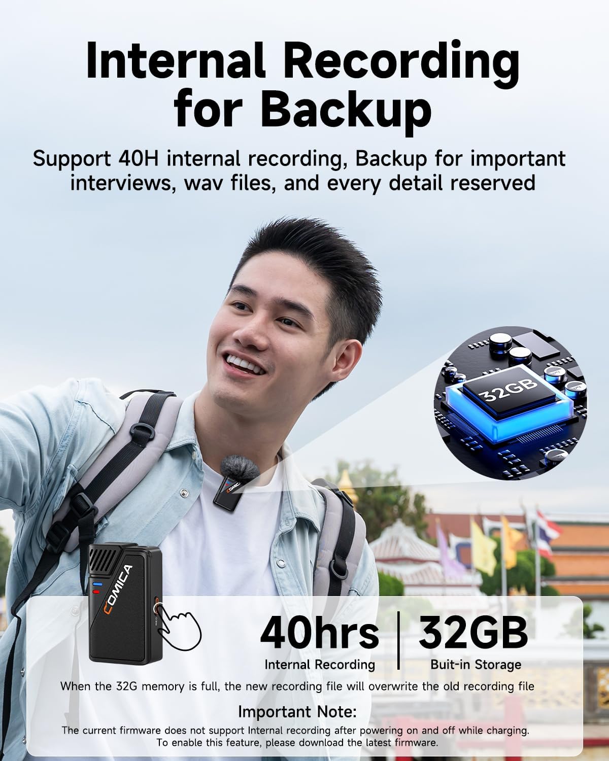 - 【32G Buit-in Storage, 40H Internal Recording】Comica BooMax wireless lapel microphone boasts a remarkable internal recording for storing your recording files in real time. 32G Buit-in Storage - store up to 40 hours of recording, which can be used for audiobackup or as a voice recorder during filming.