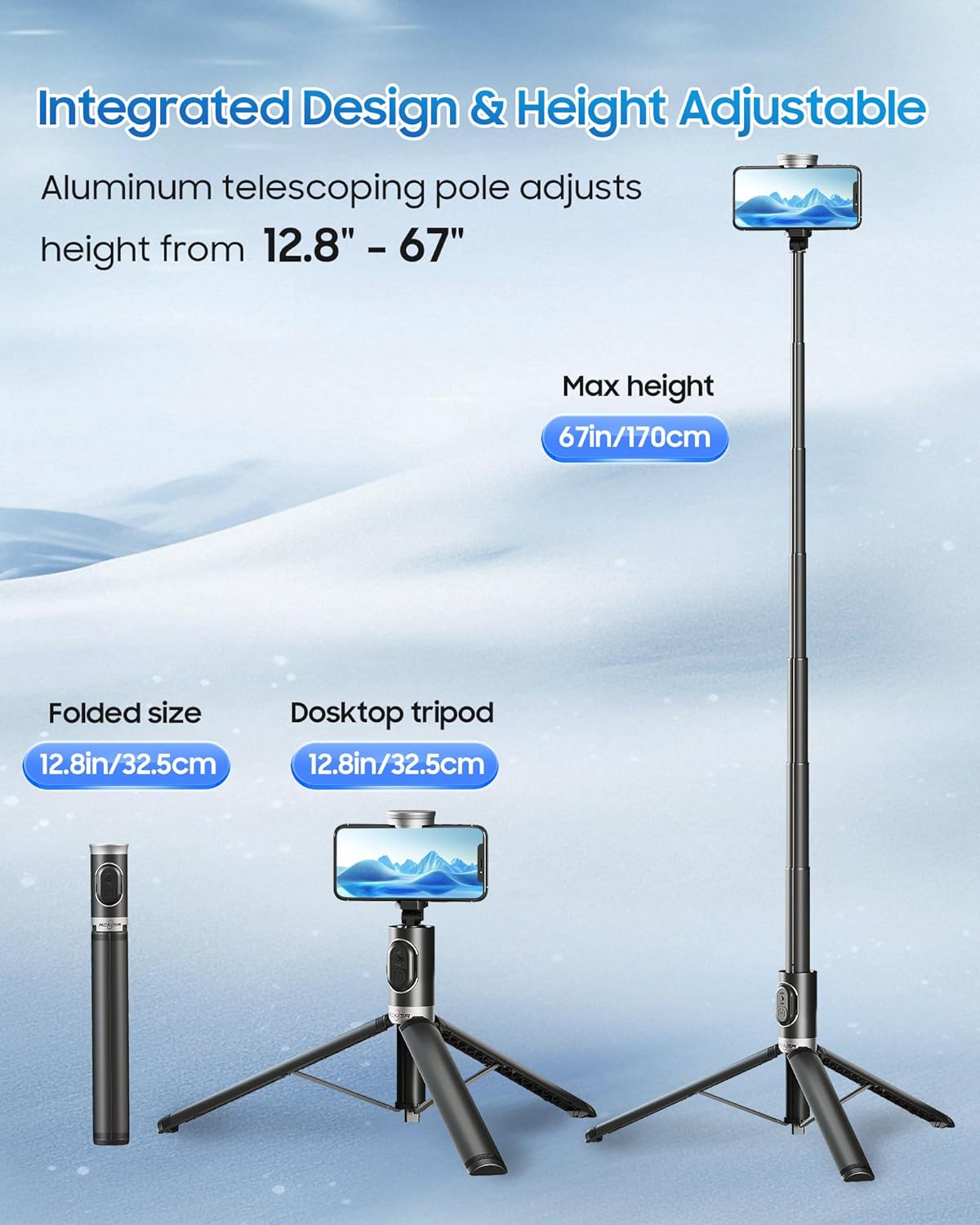 - Adjustable Tripod for Phone: Made of high-quality aluminum alloy and high-end paint process, the phone tripod stand is lightweight, strong and durable. The adjustable height of the cell phone tripod is 12.8~67 inches. Whether you're taking selfies, recording videos, or live streaming, this selfie stick offers flexibility for any height or angle