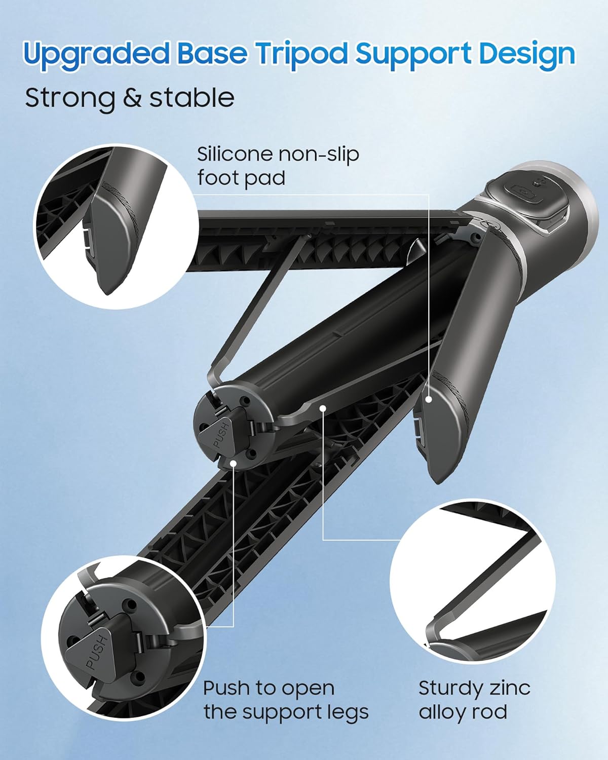 - Upgraded Tripod Support: The ACKIMA phone tripod base adopts an extended support leg design, equipped with high-quality zinc alloy connecting rods and silicone non-slip foot pads, which is more stable after unfolding. This design ensures stability on any surface, even during outdoor filming or live streaming. Just press the PUSH button at the bottom to unlock the three legs of the iPhone tripod