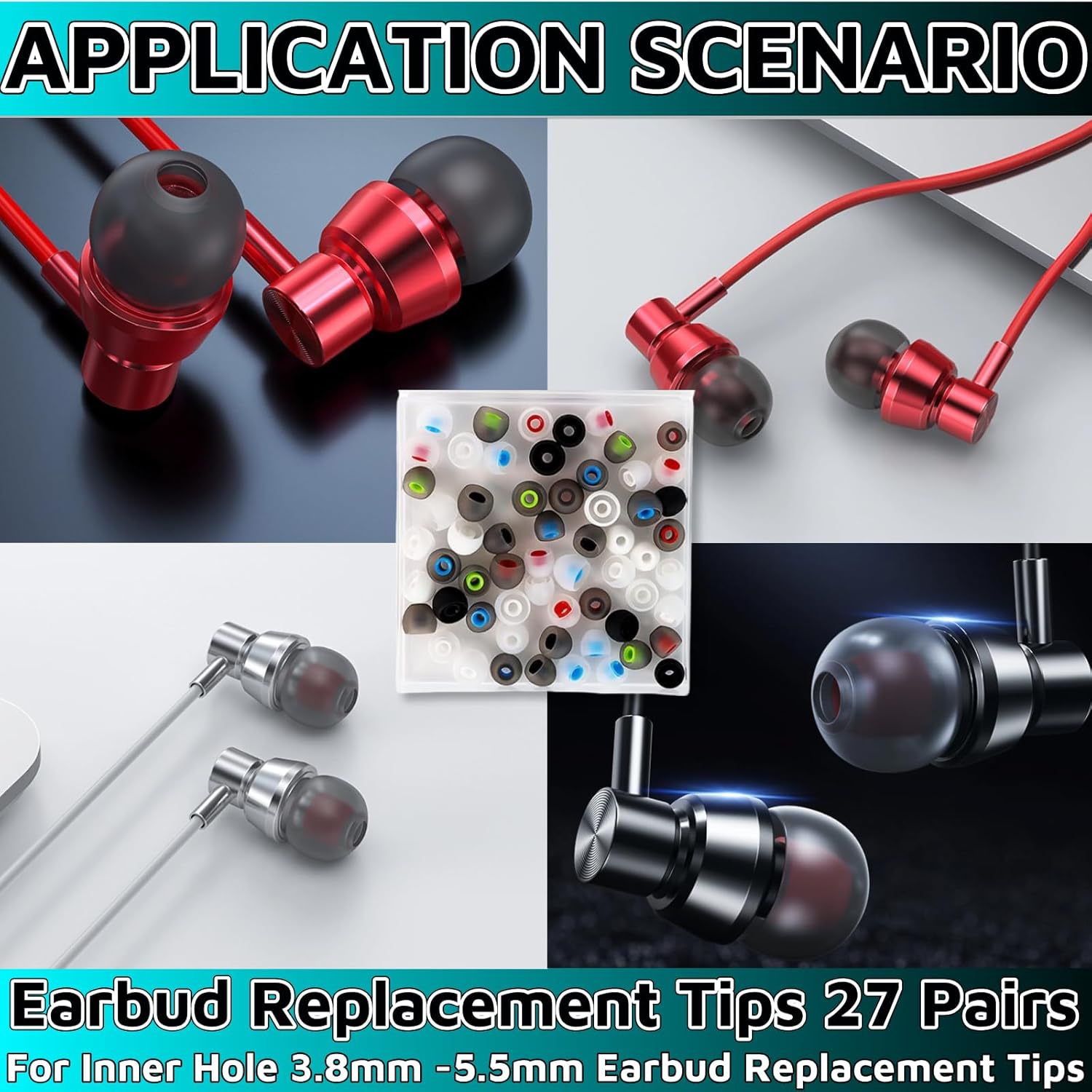 54Pcs Earbud Replacement Tips,Ear Bud Rubber Tips Silicone Earbud Tips Earbud Covers Silicone Tips Headphone Covers for Ears Headphone Ear Covers Replacement (Inner Hole 3.8mm -5.1mm) 27 Pairs S M L