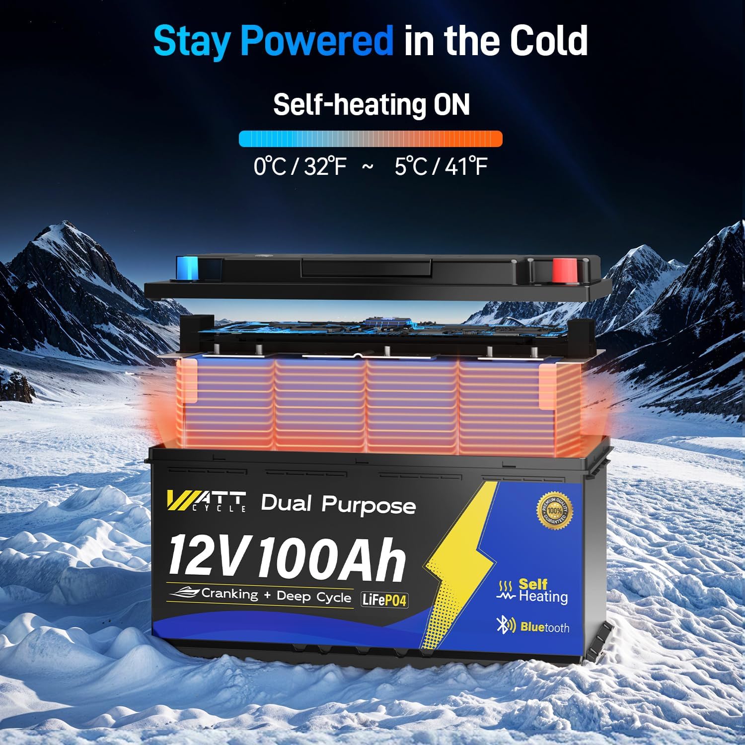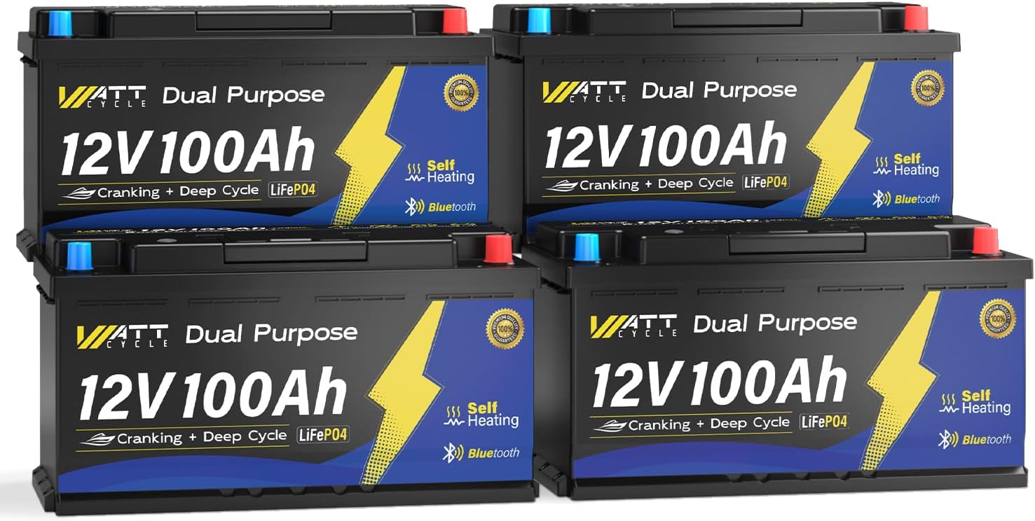 12V 100Ah Bluetooth LiFePO4 Battery, [Cranking &Deep Cycle] Lithium Battery with Self-Heating, Built-in 200A BMS, Perfect for Trolling Motor, RV, Marine, Boat(4 Pack)
