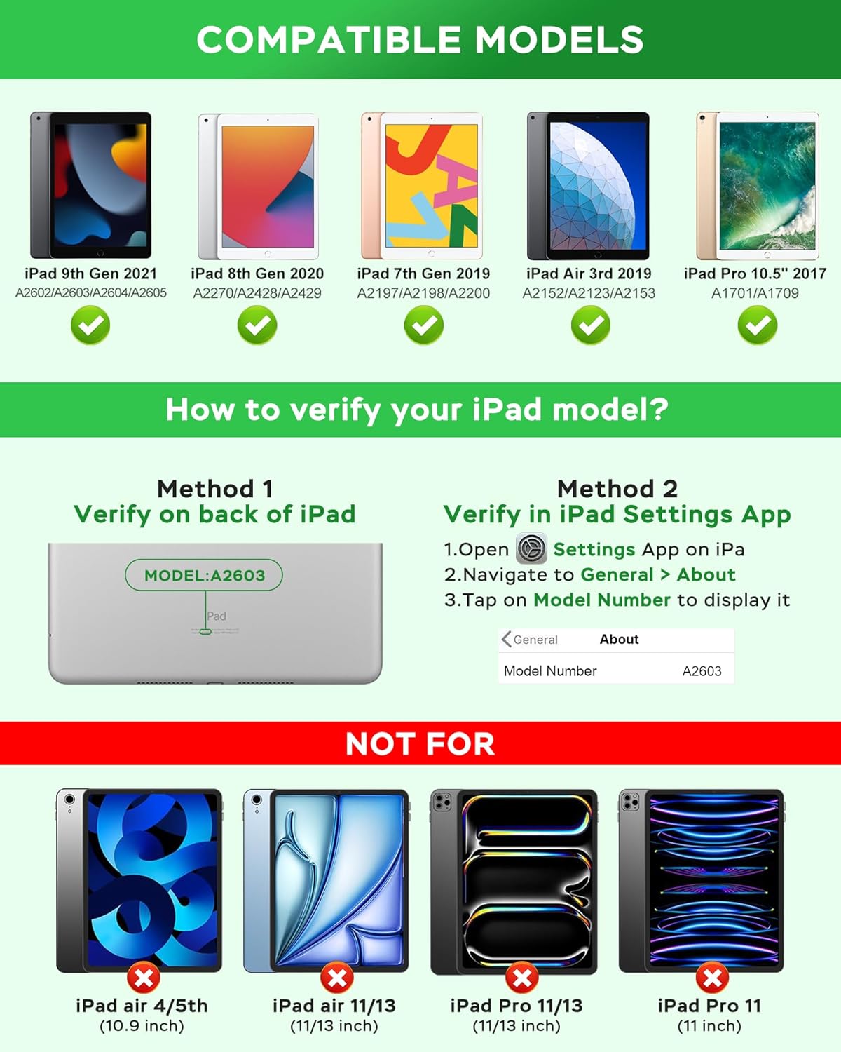 - 【For ipad Case with Keyboard 10.2/10.5 Inch】This keyboard case compatible with iPad 9th Generation 10.2inch 2021(Model Number:A2602/A2603/A2604/A2605), compatible with iPad 8th Generation 10.2inch 2020(Model Number:A2270/A2428/A2429/A2430), compatible with iPad 7th Generation 10.2inch 2019(Model Number:A2200/A2197/A2198), compatible with iPad Air 3rd Generation 10.5inch 2019(Model Number:A2123/A2152/A2153/A2154) and compatible with iPad Pro 10.5inch 2017(Model Number: A1701/A1709/A1852). Please check the model number starting with "A" on the back of your tablet before purchasing