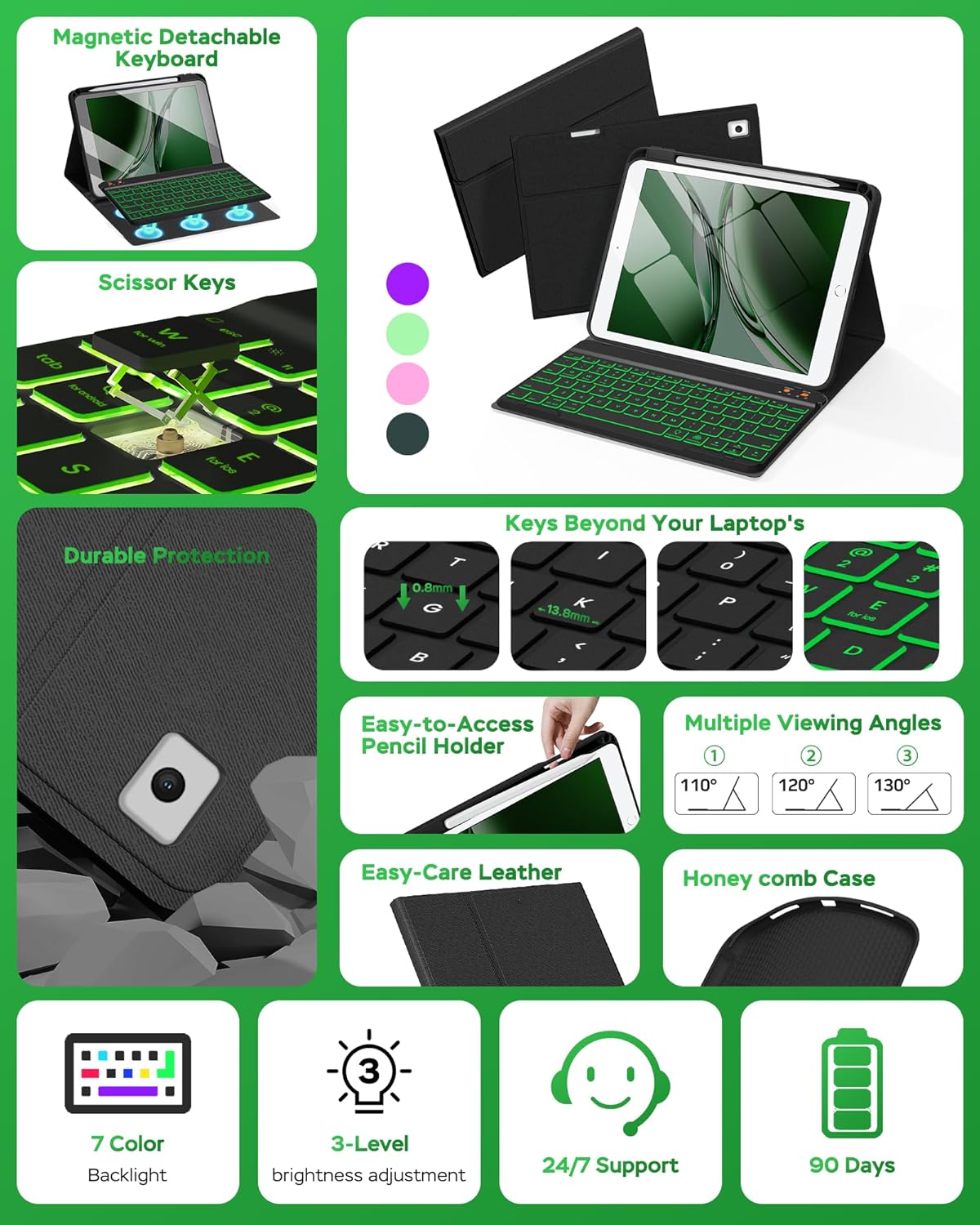 - 【Adjustable 7 Colors Backlit Keyboard】This for ipad 8th generation case with keyboard designed with laser-etched backlit keys that allow 7 vibrant colors to shine in the dark, illuminated typing is more fun and easy. Ergonomic and mechanical scissor keys with rebound feature to reduce noise, enjoy comfortable typing even long hours
