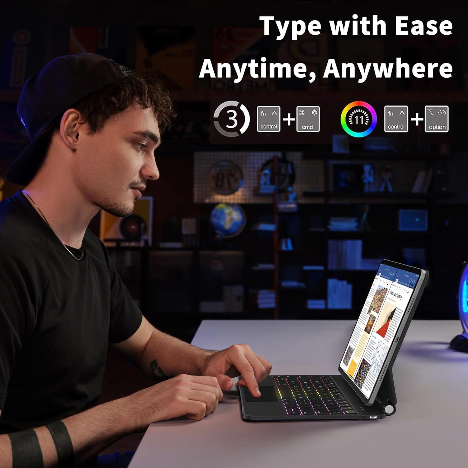 - 11-color Backlit Keyboard for iPad Pro:From dawn to dusk, adapt effortlessly! Adjusting 11 backlight and 3 levels of brightness ensures clear visuals in every setting, enhancing your immersive experience. Work daily for 3 months or nightly for 2 weeks on a single charge then recharge quickly with convenient USB-C charging.