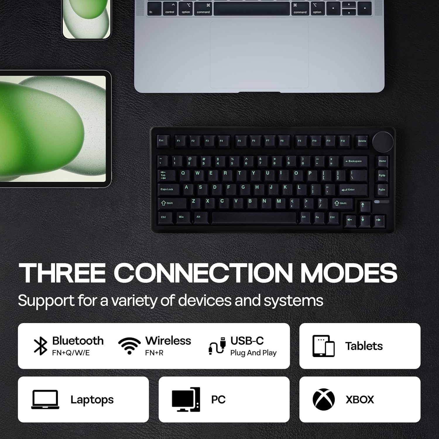 - 260 Hours Long-Lasting Wireless Keyboard: Unleash yourself from cable clutter and power anxiety with the QK81 wireless keyboard. Conquering the virtual worlds for weeks on a single charge. Boasting an incredible 4000mAh battery, this powerhouse delivers an astounding 260 hours of uninterrupted use with the vibrant backlight off, for a clean, minimalist desk setup, unburdened by tangled wires, offering complete freedom of movement for your mouse and peripherals. Cable wired, 2.4Ghz or Bluetooth wireless, easily switch between 3 connection modes with the toggle besides USB port, for stable performance on PC, Mac laptop, Android tablet, phones or gaming controllers