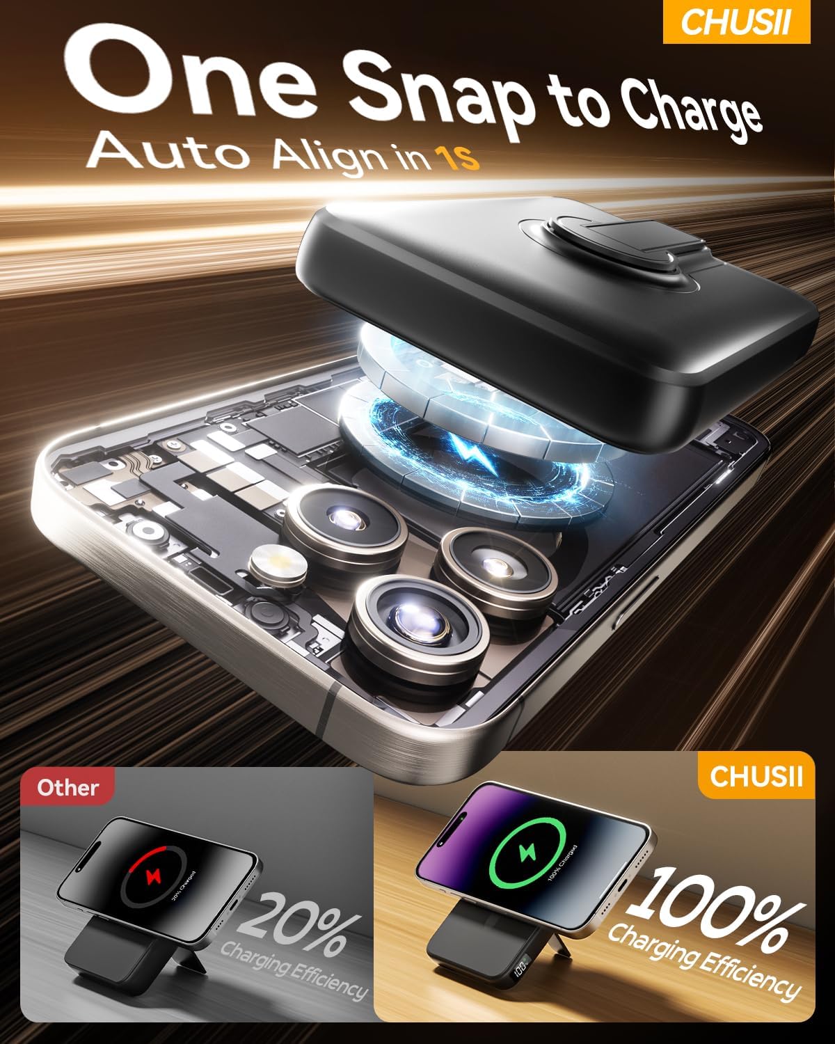 - Wireless Portable Charger- Not Constrained by “Cable”: CHUSII wireless powerbank is an ultimate go-to solution to reduce wire clutter and reduce the annoyance of plugging/unplugging charging cables. As soon as attach the battery pack, your phone recognises it and starts charging wirelessly. This feature has eliminated the hassle of dealing with loose cables and connectors, providing a seamless charging experience. The freedom it offers from wall sockets and cables allowing you to fully immerse yourself in an uninterrupted gaming experience