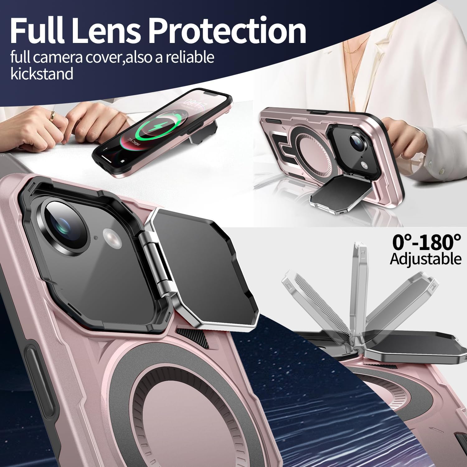 Camera Stand Case for iPhone 16E, [Compatible with Mag Safe] [Lens Cover] 2024 Version Military Grade Protective Soft Case for iPhone 16E 6.3 inch Men Women, Pink