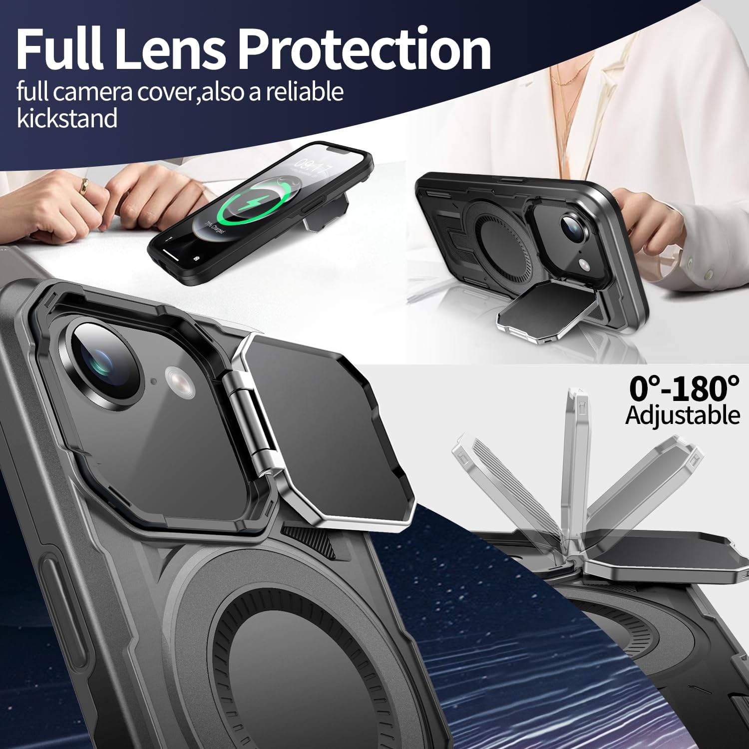 Camera Stand Case for iPhone 16E, [Compatible with Mag Safe] [Lens Cover] 2024 Version Military Grade Protective Soft Case for iPhone 16E 6.3 inch Men Women, Black