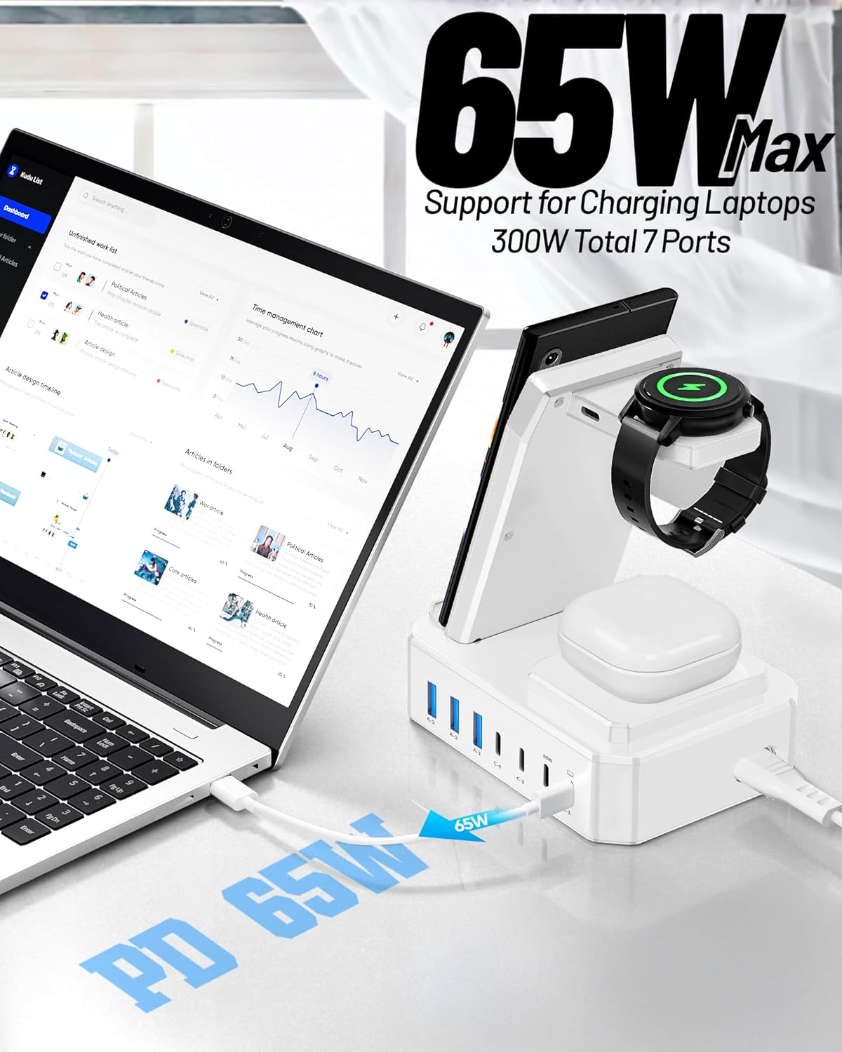 - 【300W Charging Station for Multiple Devices】: Charges up to 10 devices simultaneously.This desktop phone charging station is the perfect solution for charging multiple devices! Our charger station features 2 powerful 65W USB-C ports designed specifically for charging laptops, 2 efficient 30W USB-C ports and 3 versatile 30W USB-A ports . Samsung wireless charging station total output can be up to 300W. You can conveniently fast charge your samsung devices and other devices at the same time.