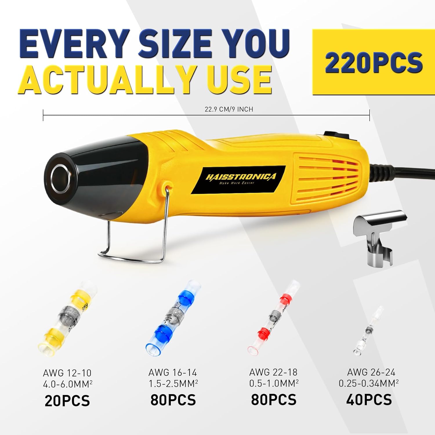 haisstronica 220 PCS Solder Seal Wire Connectors with Heat Gun Kit - Solder Sticks Wire Terminals Waterproof Electrical Connectors for Automotive, Marine, Wiring Repair