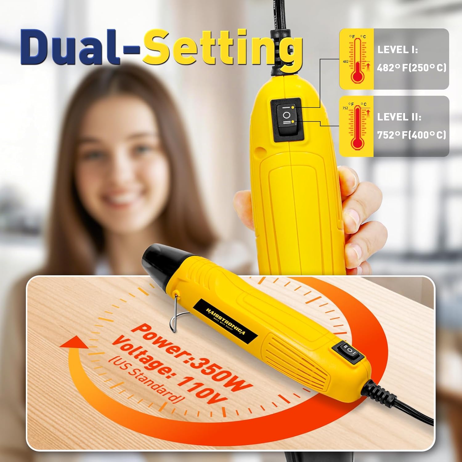 - Dual Temperature Heat Gun:Equipped with a 350W mini heat gun that offers two temperature settings: 482°F and 752°F (250°C & 400°C). Choose the right heat level for your task, ensuring precise control and professional results