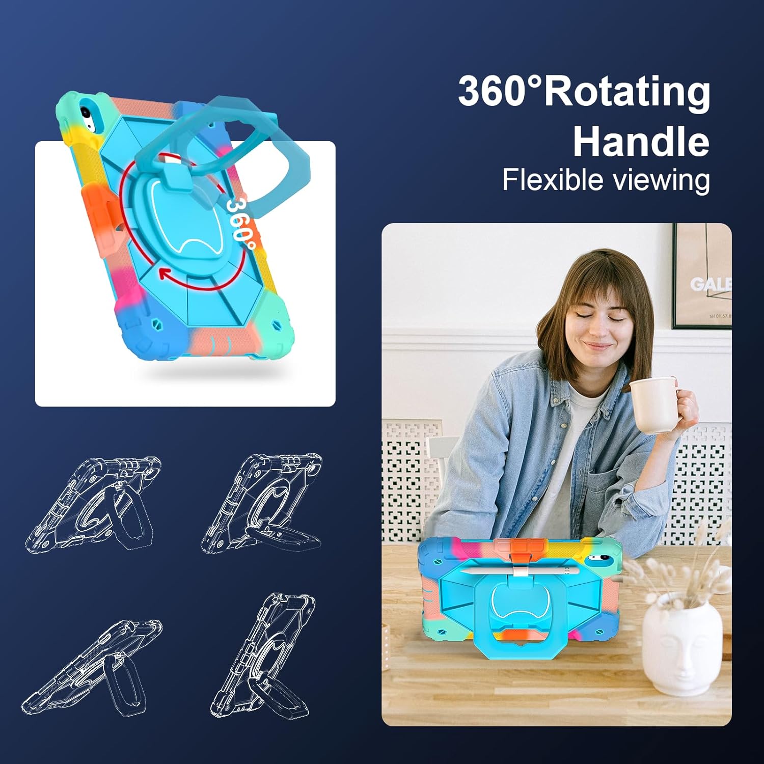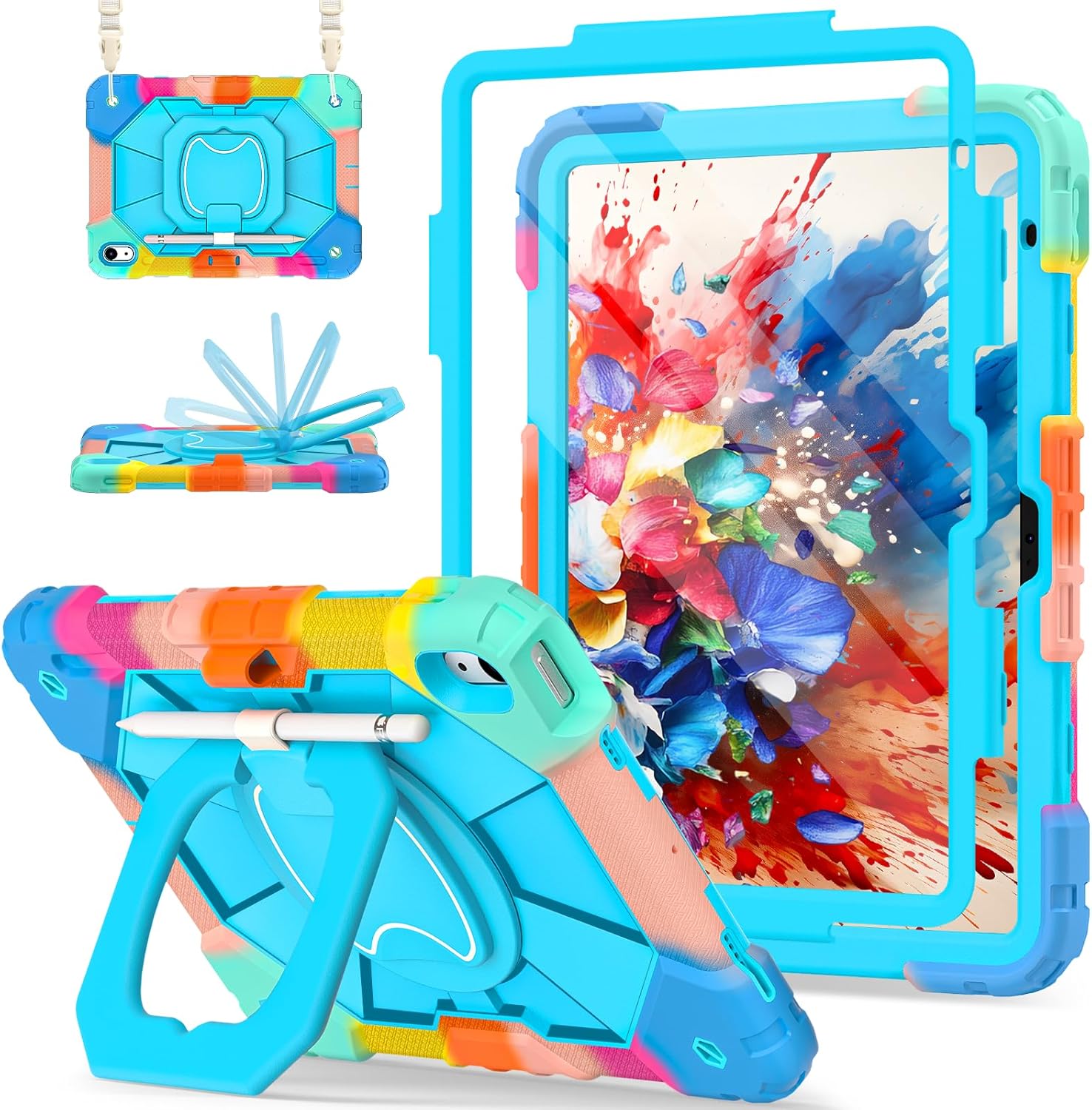 Case for iPad (A16) 11th Generation 11 Inch (2025), iPad 10th Generation Case 10.9 Inch (2022), Shockproof Cover with 360° Rotating Stand Screen Protector Pen Holder Shoulder Strap,RainbowBlue