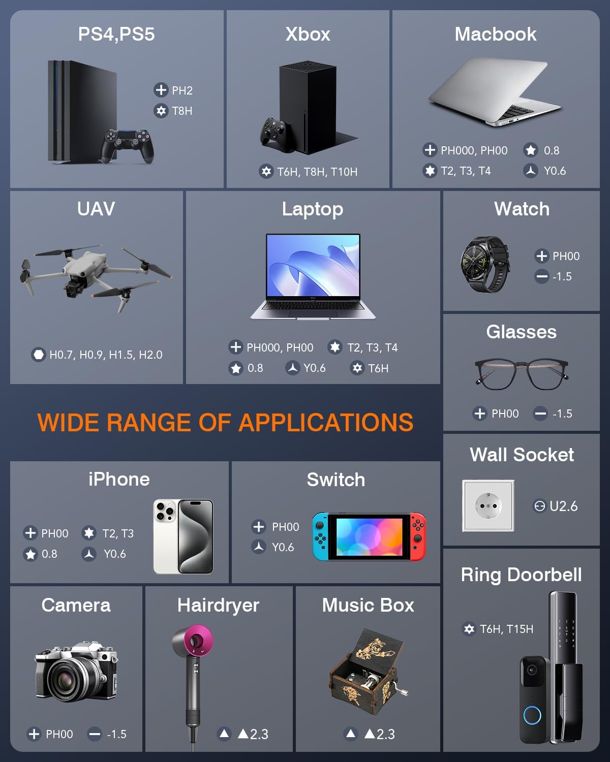 - 【Lasting Endurance】Equipped with USB fast charging cable, 1 hour fullcharge can work continuously for 1.5 hours and unscrew 1000 screws, easy to complete precision electronic equipment disassembly. Moreover, the standby battery life is 60 days,so you don't have to worry about running out of power after just a short period of use.