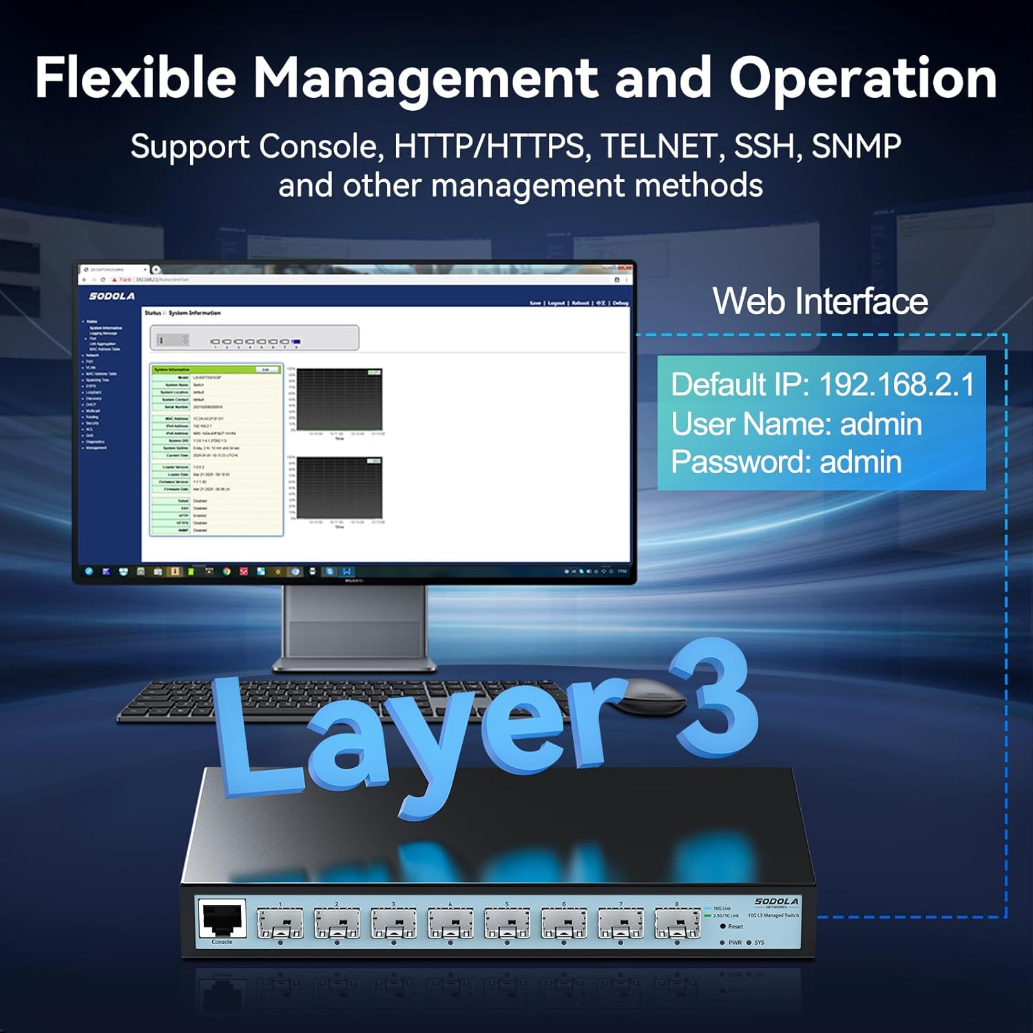 - 【Layer 3 Management】Go beyond basic switching. This 10GbE switch offers Layer 3 capabilities to manage device status and configurations (DoS,iPv4,iPv6 Routing,DHCP, LACP, VLAN, QoS, IGMP, STP, SNMP, etc.) via the intuitive web interface.