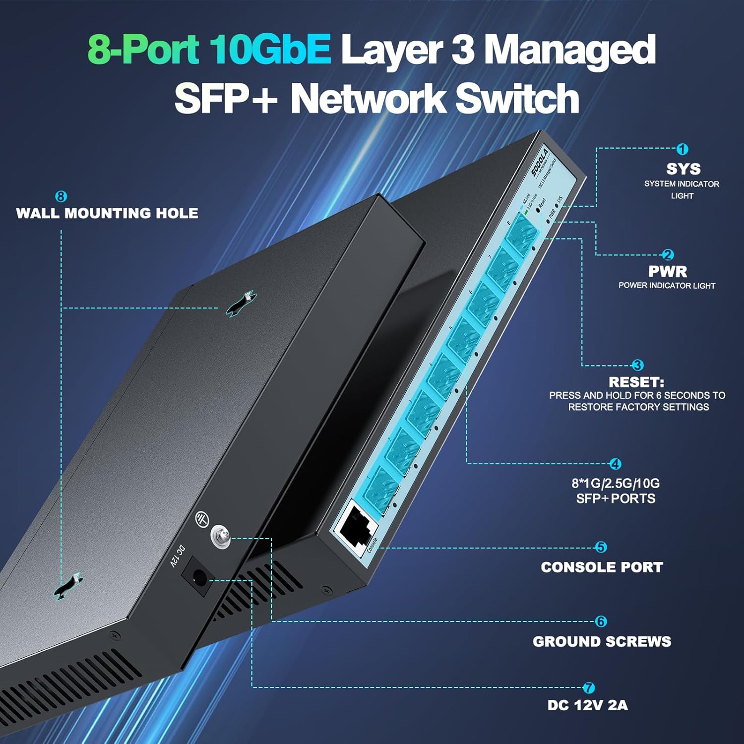 SODOLA 8 Port 10G L3 Managed Switch, 8X10G SFP+ Interface, Link Aggregation/QoS/VLAN/IGMP, Wall Mounted Fanless 10Gb SFP Network Switch(SFPPorts Only,Transceiver is NOT Included