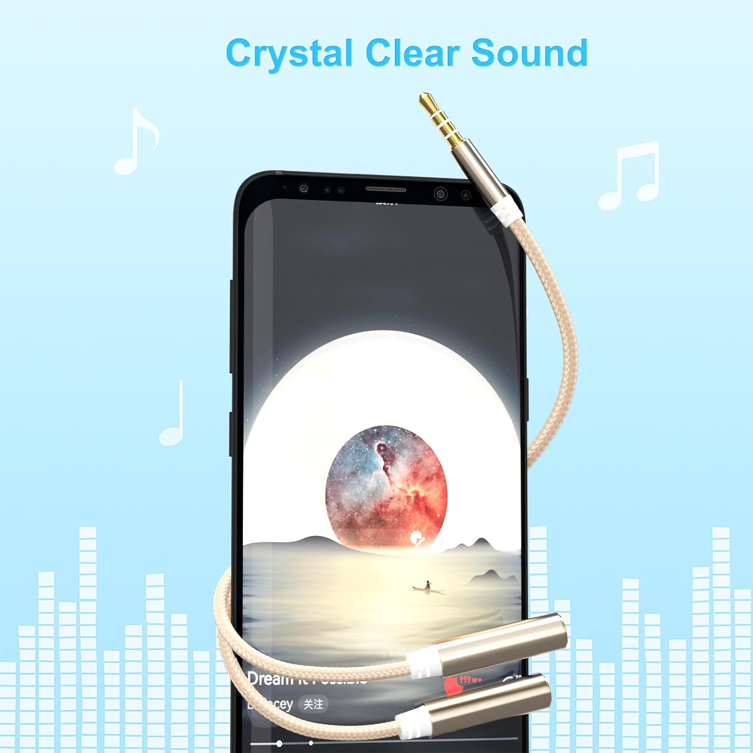 3.5mm TRRS Splitter for 2 Headphones 1FT 2-Pack, Audio & Mic, 3.5 mm Aux Jack Cable 1 in 2 out, Dual 1/8" Stereo Female Adapter, Double Headset Split Y Cord 2 Way for Phone/Tablet/Laptop/PC/MP3, Gold