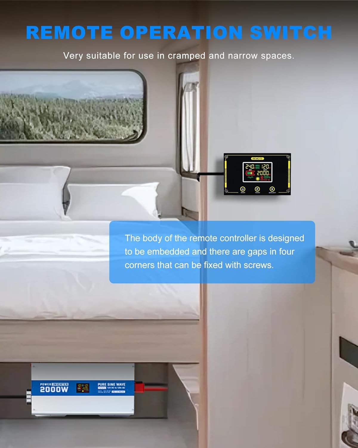 - 【LED & REMOTE CONTROLLER】The remote controller with a 16.4ft cable makes it more convenient to operate in different situations. LED screen has accurate responses in normal and abnormal working conditions. The rich accessory package allows you to use it freely, the inverter includes 2 120V AC output ports, 1 USB port 5V 2.4A, and 1 AC terminal board. Box includes 2 2.62ft 5AWG positive and negative battery cables, a 1.64ft ground wire, and 5 40A 32V fuses.