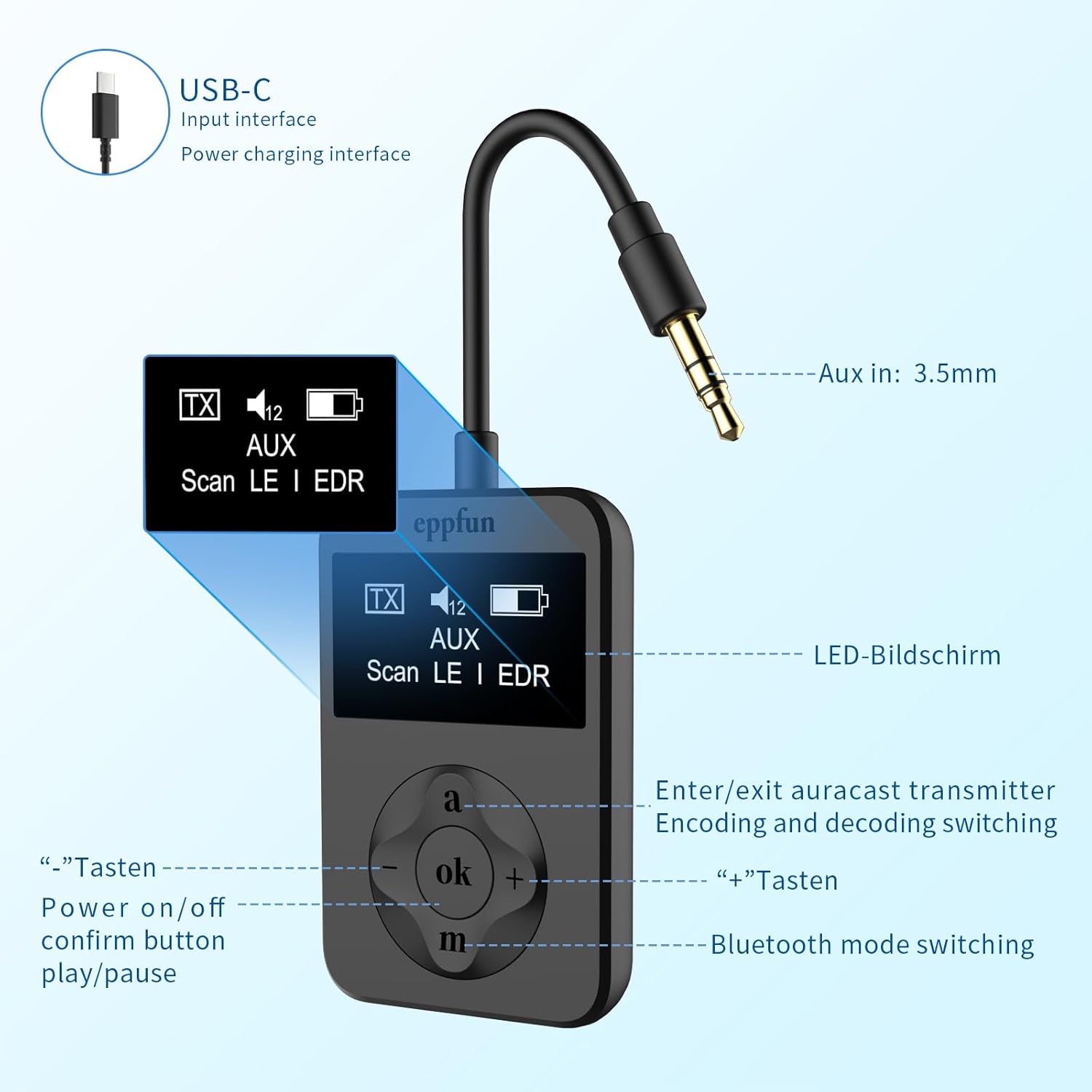 eppfun Bluetooth Auracast Transmitter, LC3, AptX Lossless, AptX HD, USBC/3.5mm Aux Inputs, Bluetooth 5.4, Qualcomm Chip, for TV, PC,Airplane,Phones