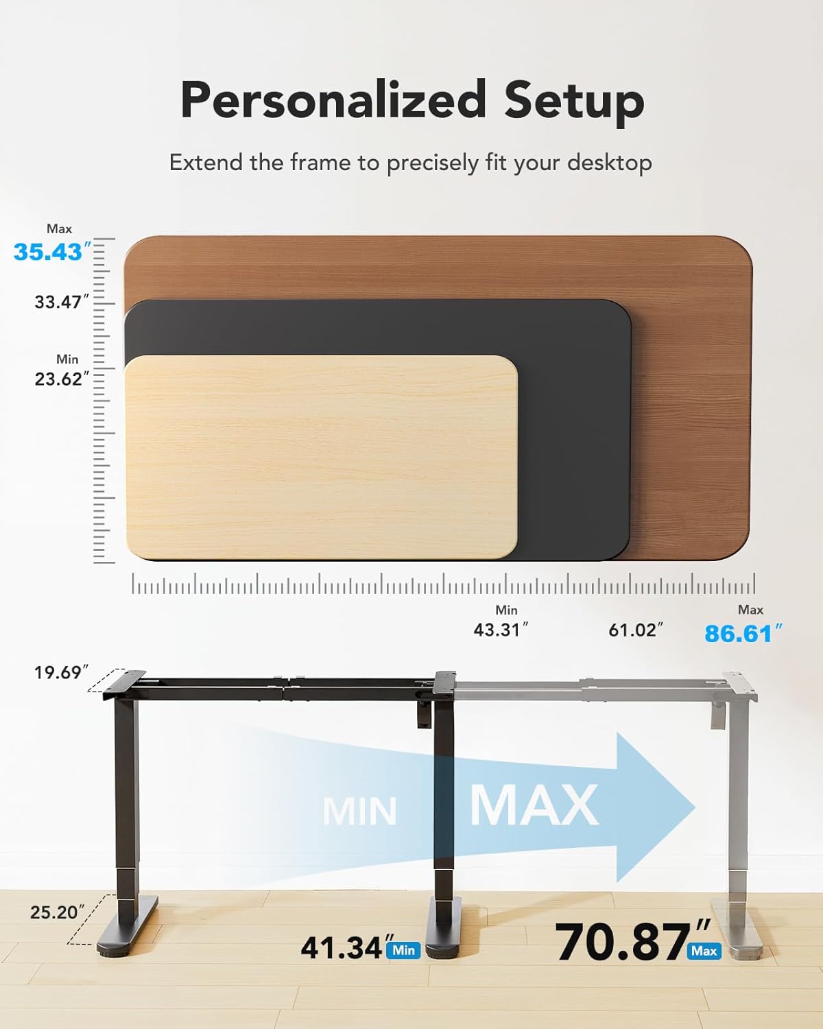 - DIY Your Desktop: This sit-stand desk frame features adjustable crossbars that fit desktops ranging from 35.43″ to 86.61″ wide and 23.62″ to 43.31″ deep. Choose your desktop material, size, and color. Create the ideal work or study space tailored to your style and needs!
