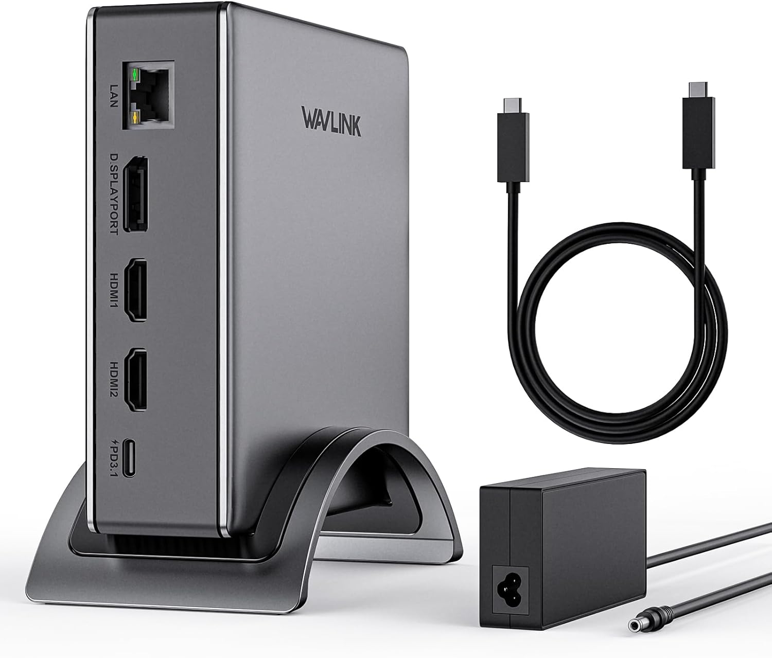 - 9-in-1 Docking Station : This WAVLINK usb docking station has single 8K@30Hz/4K@144Hz dual HDMI+DisplayPort video outputs, wired Gigabit Ethernet port, 1* USB-C 3.2 and 2* USB-A 3.0, 3.5mm combination audio jack. Includes both a PD3.1-140W charger adapter and USB-C cable. Allow your PC to connect a variety of devices with just one cable to the docking station