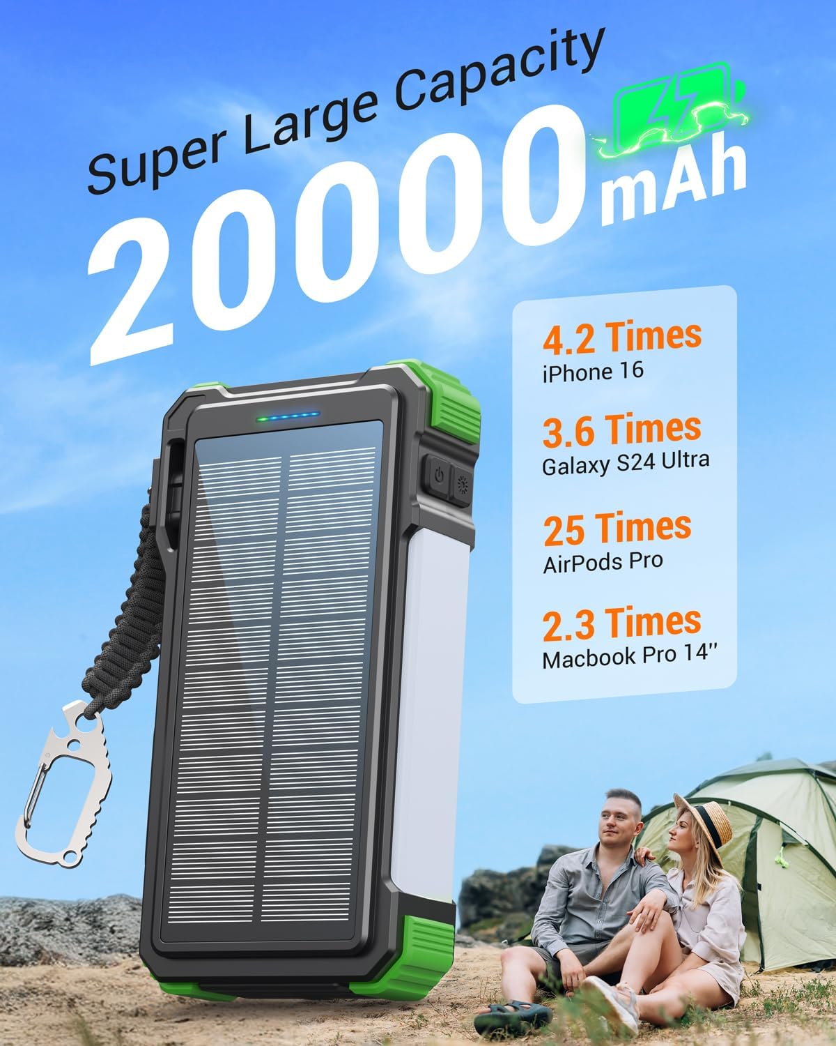 - Massive Battery Capacity: BLAVOR solar powered power bank has a real-rated 74000mWh/20000mAh high capacity, let you get rid of the anxiety about devices electricity anytime, anywhere. With a fully charged, it can recharge the iPhone16 4.2 times, Galaxy S24 Ultra 3.6 times, iPad Air 2.7 times and Macbook Pro 14''2.3 times. This is truly the best travel charger for multiple devices