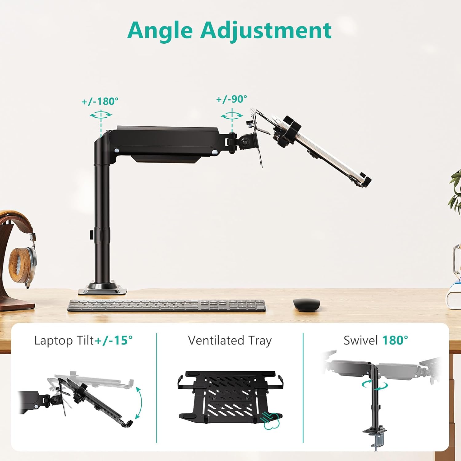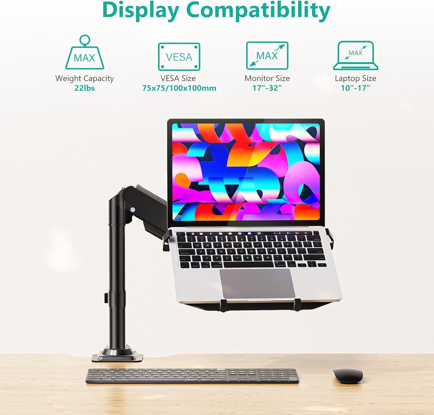 WALI Laptop Tray Desk Mount, Laptop Arm Mount Fits 10-15.6 Inch Notebook, 2-in-1 Gas Spring Monitor Arm for 17-32 Inch Computer Screen, Holds up to 22lbs(GSDM00LP), Black